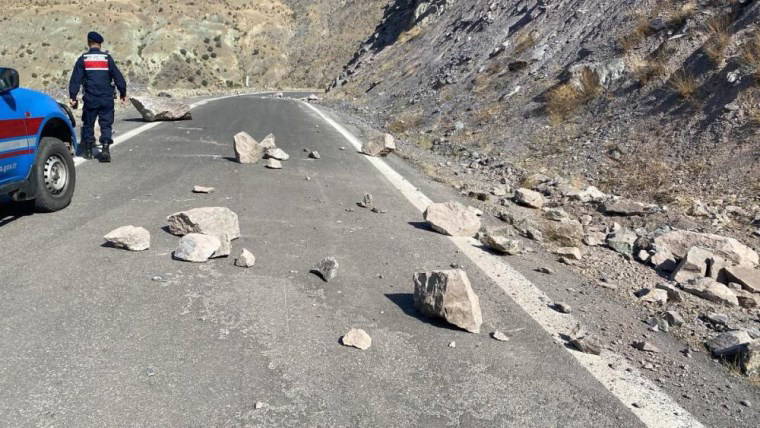 Güçlü sarsıntının etkisiyle dağlardan kopan kaya parçaları yollara düştü.