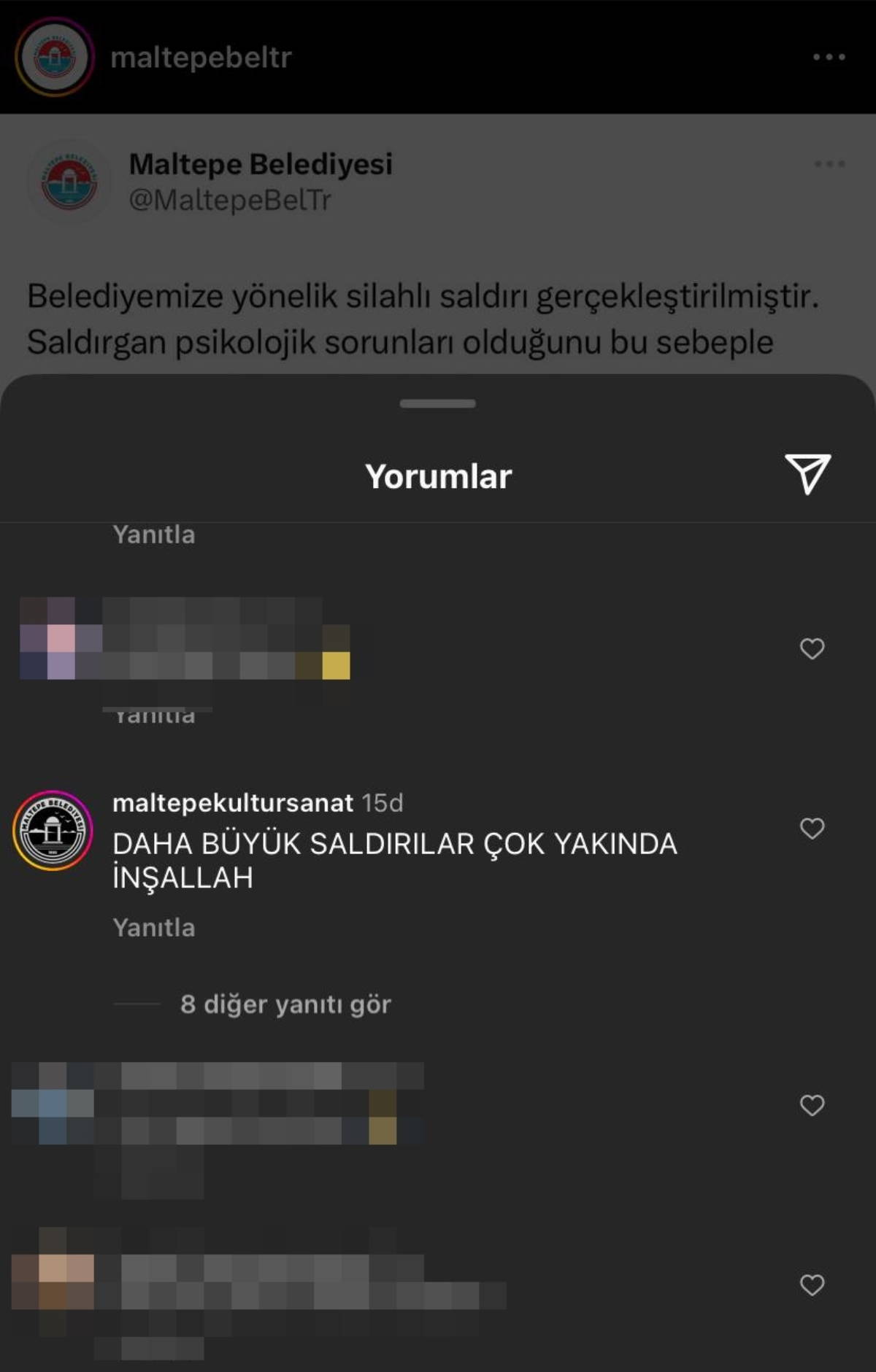Maltepe Belediyesi saldırıya ilişkin açıklamasını resmi Instagram hesabından da yayımladı. Söz konusu paylaşımın altına "Maltepe Kültür Sanat" isimli bir hesabın yaptığı "Daha büyük saldırılar çok yakında inşallah" yorumu dikkat çekti.