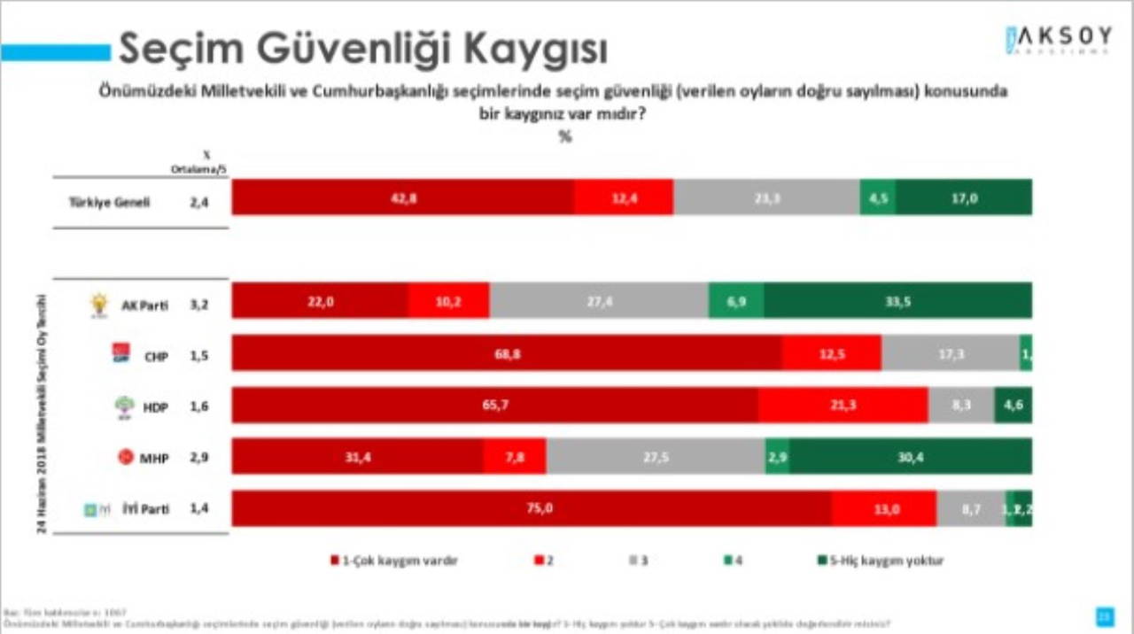 SON ANKET ÇALIŞMALARI NE SÖYLÜYOR?Aksoy, seçim güvenliğine ilişkin kaygı taşıyan seçmenin partilere göre oranı hakkında kritik açıklamalarda bulundu. Muhalif partilere oy veren seçmenin görece daha fazla bu endişeyi taşıdığını belirten Aksoy, kararsız seçmenle ilgili, “Son ölçümde bu oran yüzde 12,8” dedi. Aksoy, ekonomiye dair karamsarlık halinin ise genç seçmende yetişkinlere göre çok daha yüksek olduğunu vurguladı. AKSOY: SEÇİM GÜVENLİĞİ KONUSUNDA KAYGILI OLMAYANLARIN ORANI YÜZDE 21.5Yurttaşlar seçim güvenliğine ilişkin endişe taşıyor mu? Seçim güvenliğiyle ilgili endişe duyanların/ duymaların ittifaka göre dağılımı nasıl şekilleniyor? Bu kaygı seçmende halihazırda vardı. Geçtiğimiz aylarda seçim kanununda yapılan değişiklik, özellikle sandık güvenliği ile simgeleşmiş bir isim olan Canan Kaftancıoğlu’nun siyasi yasaklı hale getirilmesi mevcut kaygıyı daha da büyüttü. Henüz geçen hafta yaptığımız ölçüme göre seçim güvenliği konusunda kaygısı olmadığını belirtenlerin oranı yalnızca yüzde 21,5. Üstelik bu yanıtı verenlerin neredeyse tamamını AKP’li ve MHP’li seçmen oluşturuyor. Kaygı duyduğunu belirtenlerin oranı CHP seçmeninde yüzde 81,3, HDP seçmeninde yüzde 87 ve İYİ Parti seçmeninde yüzde 88 düzeyinde. Yani muhalif partilere oy veren seçmen görece daha fazla bu kaygıyı taşıyor.