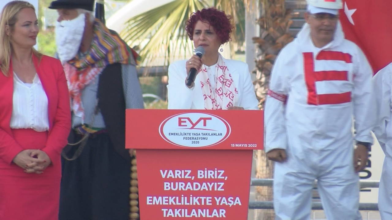 Mitingte konuşma yapan Emeklilikte Yaşa Takılanlar (EYT) Federasyonu Başkanı Gönül Boran Özüpak, "Dünyanın hiçbir yerinde EYT diye bir problem yok. EYT problemi bize, yani Türkiye'ye has bir problemdir. Nedenleriyle, nasıllarıyla, tamamen yerli ve milli toplumsal bir problemdir. Yaklaşan genel seçimle birlikte en güzel tepkimiz demokratik hakkımızı kullanırken sandıkta tercihimizi bizi anlayan, bizi dinleyen ve yanımızda olanlardan yana kullanmamız olacaktır.