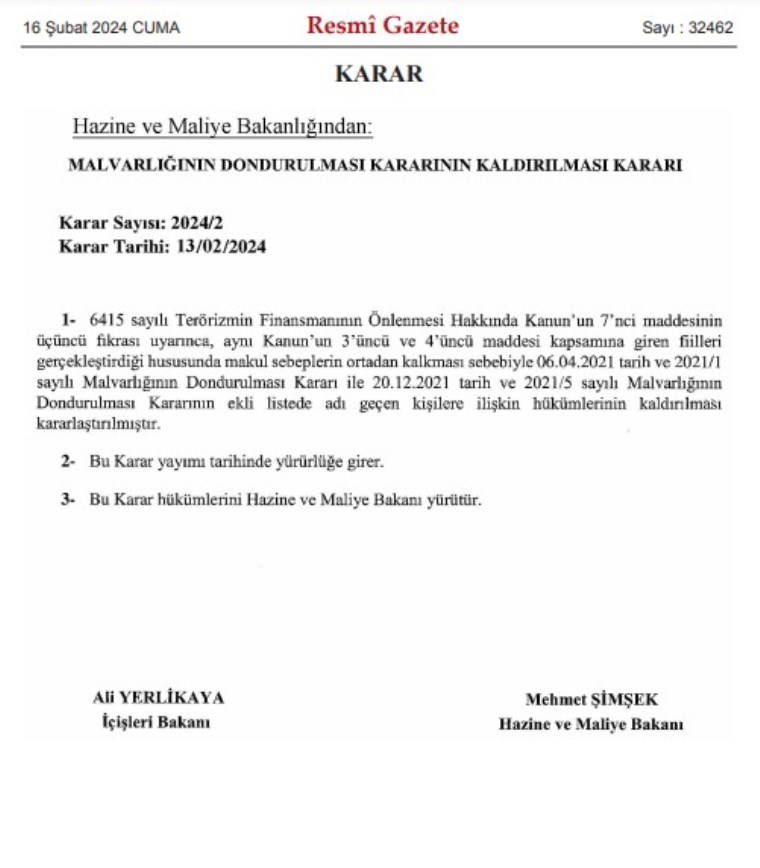 Hazine ve Maliye Bakanlığı tarafından hazırlanan "Malvarlığının Dondurulması Kararlarının Kaldırılması Kararı" Resmi Gazete'de yayımlanarak yürürlüğe girdi.