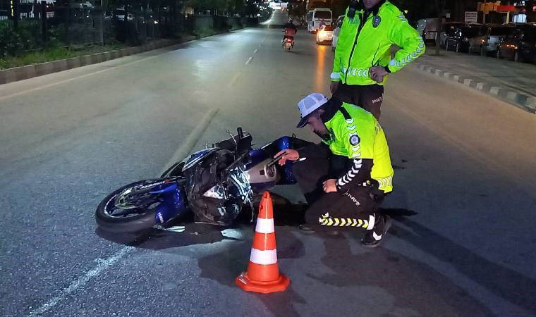 Manisa'nın Yunusemre ilçesinde sürücüsünün kimliği henüz tespit edilemeyen motosiklet, Yeni Mahalle Mimar Sinan Bulvarı'nda refüjdeki demir korkuluklara çarptıktan sonra devrildi.