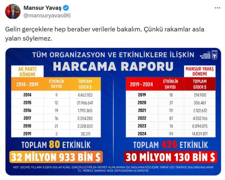 AKP ve CHP döneminin karşılaştırılmasına yer verilen paylaşımda, 2014-2019 AKP döneminde 80 etkinlik için toplam 32 milyon 933 bin dolar ödendiği ortaya çıkarken; CHP'li başkan Mansur Yavaş döneminde ise 426 etkinlik için 30 milyon 130 bin dolar harcandığı aktarıldı.