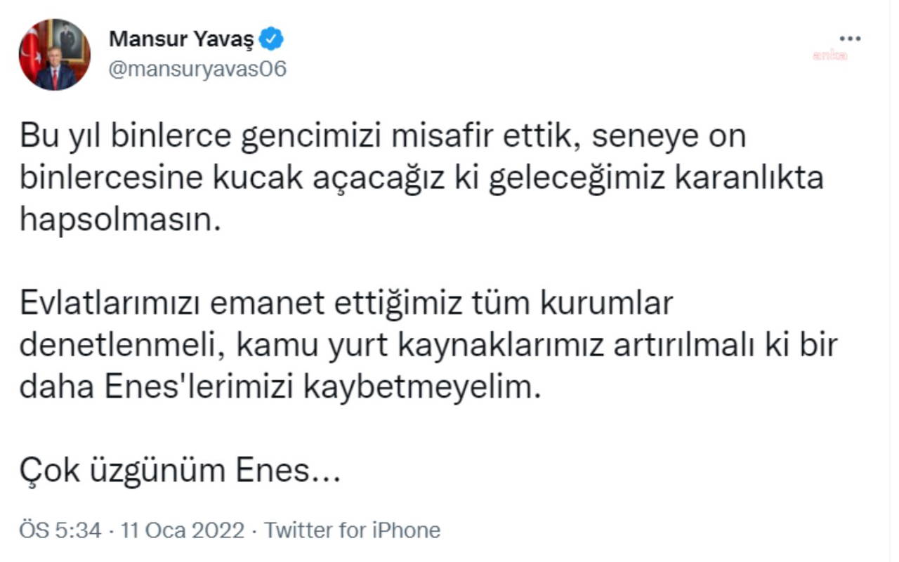 Yavaş, sosyal medya hesabından paylaştığı mesajda "Evlatlarımızı emanet ettiğimiz tüm kurumlar denetlenmeli, kamu yurt kaynaklarımız artırılmalı ki bir daha Eneslerimizi kaybetmeyelim" ifadelerini kullandı.