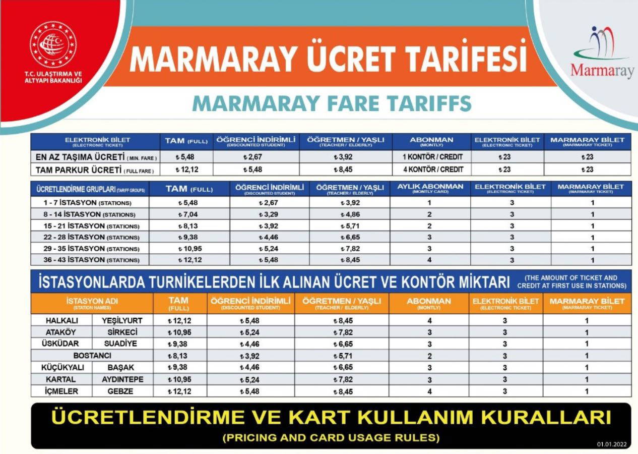 Marmaray Tam Parkur ücreti 12,12, öğrenci ücreti 5,48 ve öğretmen/yaşlı ücreti 8,45 liraya yükseldi. En az yani en kısa taşıma ücreti tam 5.48, öğrenci indirimli 2.67 ve öğretmen/yaşlı 3.92 liraya çıktı. Elektronik bilet ve Marmaray bileti 23 lira olurken durak mesafesine göre alınacak ücretler ise şöyle oldu: