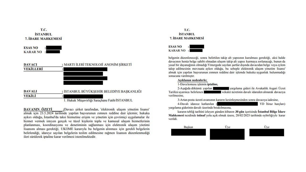 İstanbul 7'nci İdare Mahkemesi, Martı’nın e-ulaşım lisansı almasına onay verdi. Böylece Martı TAG hizmeti, yasal zeminde faaliyet göstermeye devam edecek.