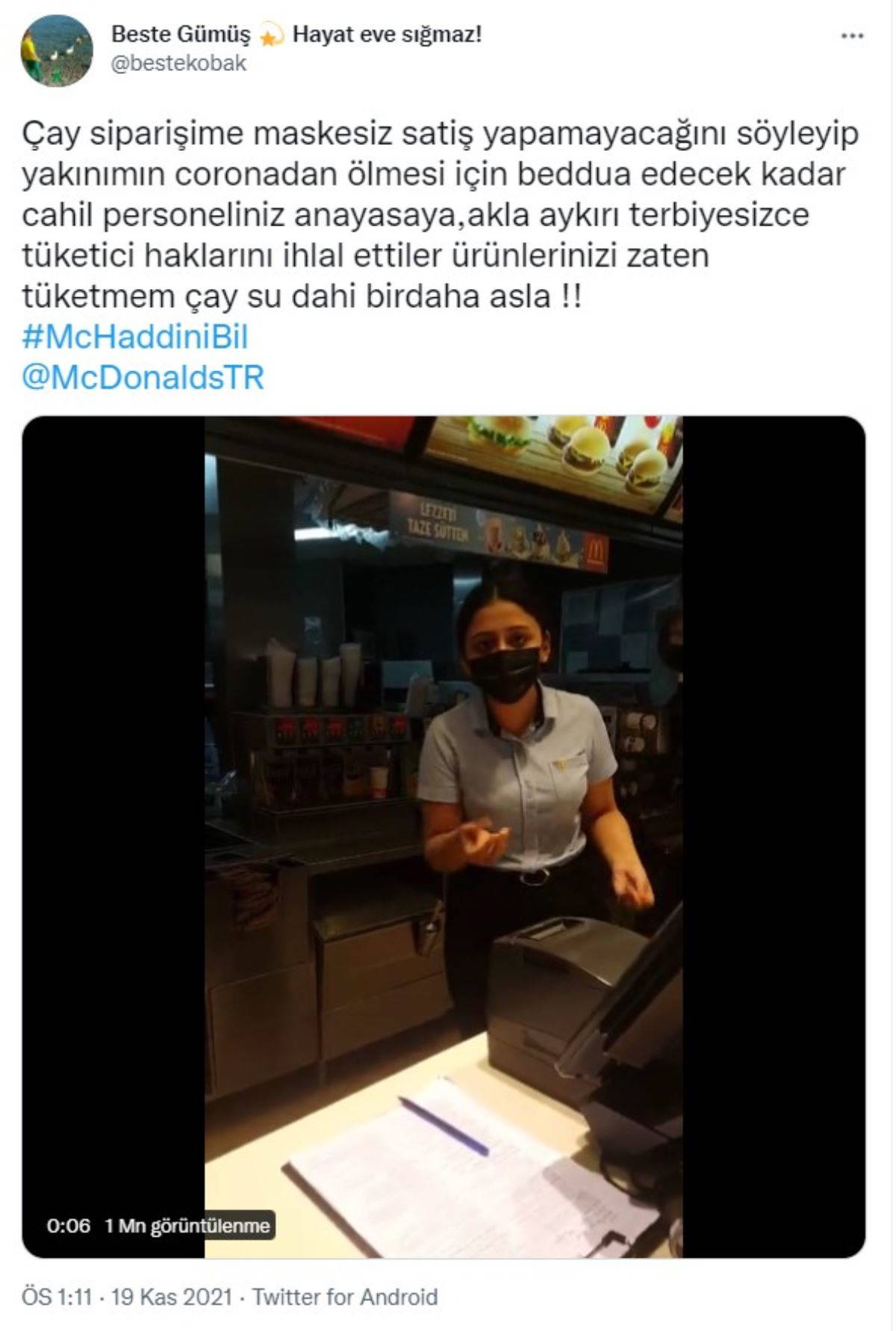 Sosyal medyada hesabından paylaştığı videoda "Çay siparişime maskesiz satış yapamayacağını söyleyip yakınımın koronavirüsten ölmesi için beddua edecek kadar cahil personeliniz anayasaya, akla aykırı terbiyesizce tüketici haklarını ihlal ettiler ürünlerinizi zaten tüketmem çay su dahi bir daha asla !!" paylaşımında bulundu.