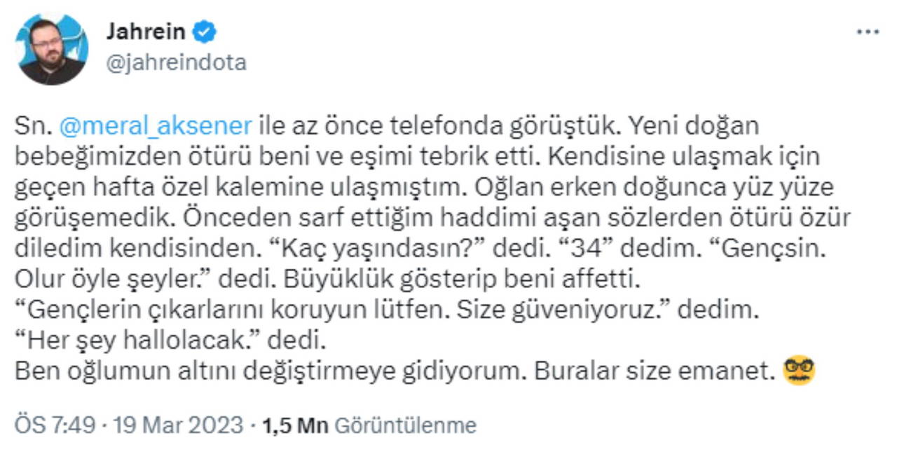 "Sayın Meral Akşener ile az önce telefonda görüştük. Yeni doğan bebeğimizden ötürü beni ve eşimi tebrik etti. Kendisine ulaşmak için geçen hafta özel kalemine ulaşmıştım. Oğlan erken doğunca yüz yüze görüşemedik. Önceden sarf ettiğim haddimi aşan sözlerden ötürü özür diledim kendisinden. 'Kaç yaşındasın?' dedi. '34' dedim. 'Gençsin. Olur öyle şeyler.' dedi. Büyüklük gösterip beni affetti. 'Gençlerin çıkarlarını koruyun lütfen. Size güveniyoruz' dedim. 'Her şey hallolacak' dedi. Ben oğlumun altını değiştirmeye gidiyorum. Buralar size emanet."