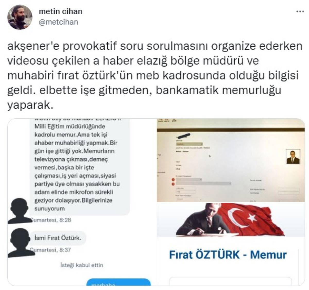 Gazeteci Metin Cihan, Öztürk'ün memur olduğuna ilişkin kendisine gelen bilgi ve belgeleri Twitter hesabından yayımladı.