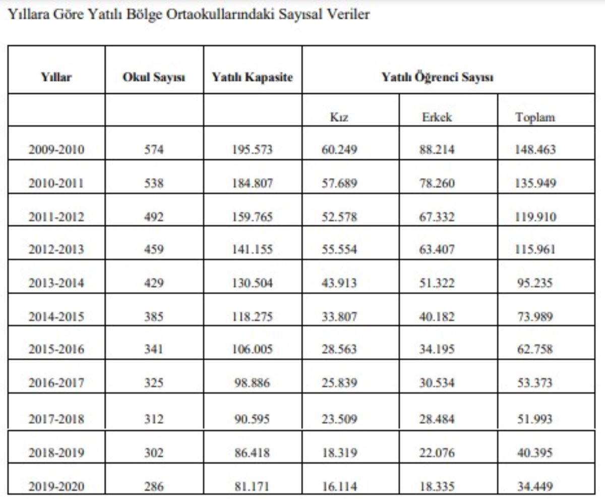 Rapordaki en dikkat çeken kısım ise yatılı bölge ortaokulları ve bu okullarda okuyan öğrencilere ilişkin kısım oldu. Rapora göre, 2009-2010 döneminde 574 olan okul sayısı, 5 yılda 189, 10 yılda ise 288 azaldı. Böylece, yatılı bölge ortaokul sayısı, 2019-2020 döneminde 286’ya kadar geriledi. 195 bin 573 olan yatılı kapasite ise 10 yılda 114 bin 402 azalarak 81 bin 171’e düştü. Yatılı öğrenci sayısı da okul sayısının düşmesiyle birlikte azaldı. Toplam 148 bin 463 olan yatılı öğrenci sayısı, 10 yılda 114 bin azalarak 2019-2020 döneminde 34 bin 449’a kadar indi.