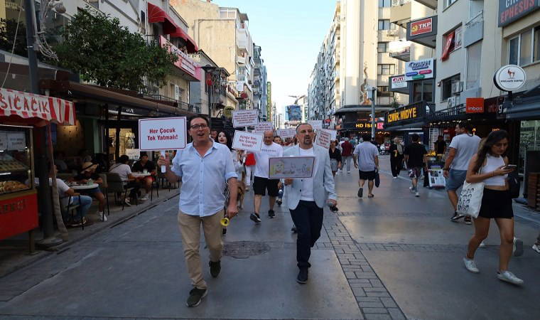 “Çocuk beslenmesinde tasarruf olmaz”, “Beslenme çantası boş kalmasın”, “Çocukların karnı zil çalıyor” sloganları atan koalisyon üyeleri adına basın açıklamasını okuyan Gıda Mühendisleri İzmir Şube Başkanı Ömer Ulaş Kırım, yetersiz ve dengesiz beslenen öğrencilerin dikkat sürelerinin kısaldığını, algılamalarının azaldığını, öğrenmede güçlük ve davranış bozuklukları yaşadıklarını, okul devamsızlık sürelerinin uzadığını ve okul başarılarında azalma olduğunu ortaya koyduğuna dikkat çekerek, “Ülkemiz ekonomi ve işgücü piyasasındaki daralma, sosyal politikalardaki kısıtlamalar nedeniyle ortaya çıkan gelir dağılımındaki eşitsizlikler, yoksulluk, işsizlik, yüksek enflasyon, gıda kalitesizliği ve güvencesizliği neticesinde birçok aile için sağlıklı ve besin değeri yüksek gıdalara erişim zorlaşmıştır. Yüksek enflasyon sebebiyle son yıllarda her üründe olduğu gibi gıda fiyatları da katlanarak artmıştır” dedi.