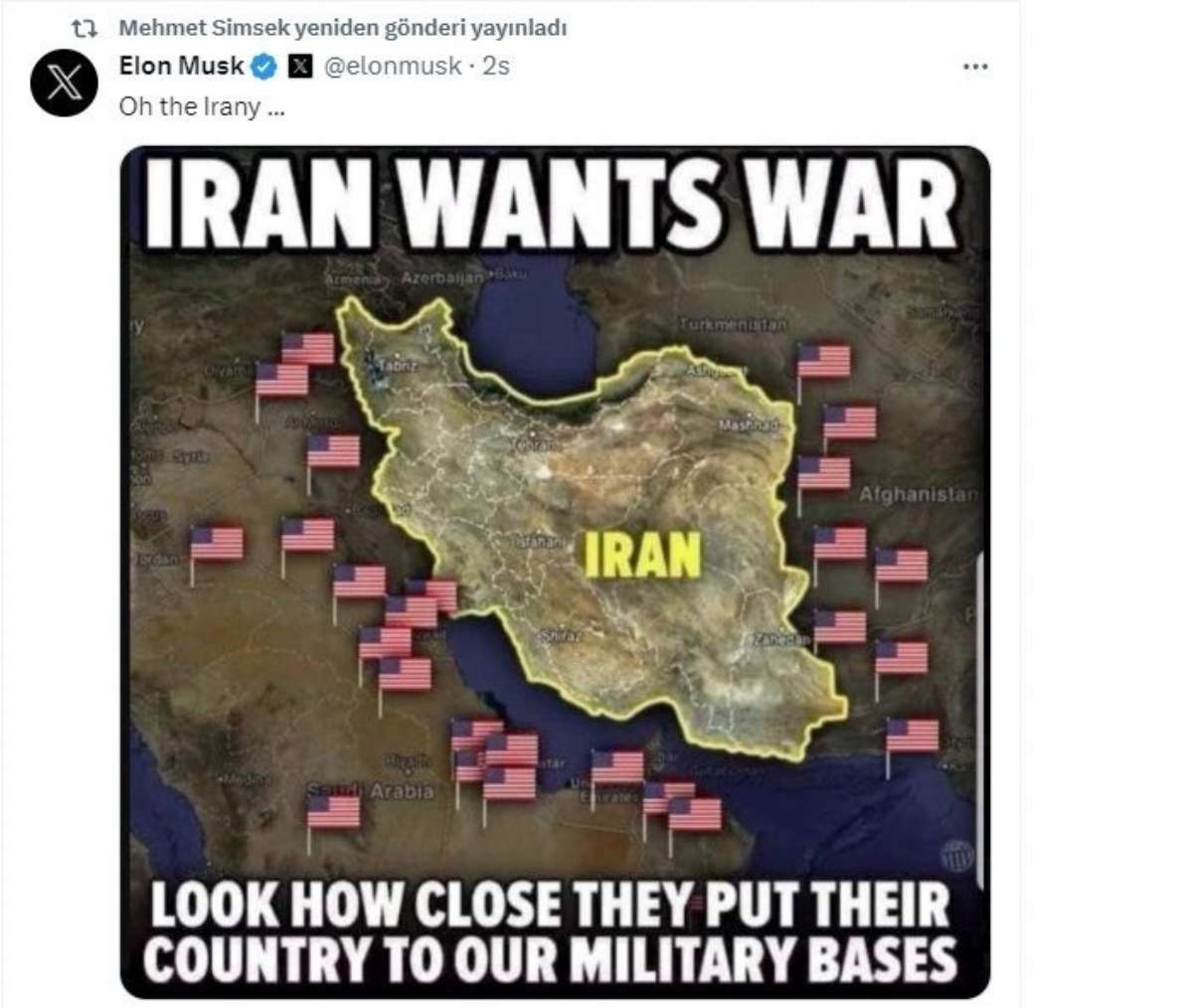 Musk, üzerinde "İran, savaş istiyor. Bakın, onlar ülkelerini bizim askeri üslerimizin ne kadar yakınına kurmuşlar" ifadelerinin yer aldığı bir Orta Doğu fotoğrafı paylaştı.