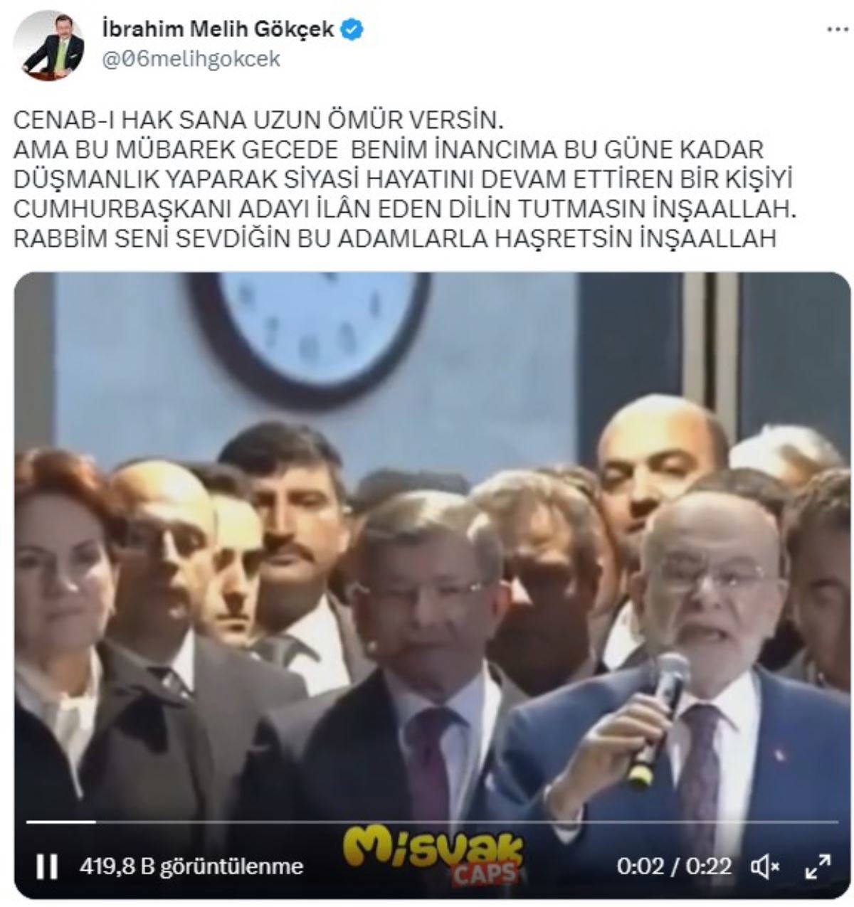 Görevinden istifa ettirilen eski Ankara Büyükşehir Belediye Başkanı Melih Gökçek ise Kılıçdaroğlu'nun adaylığını duyuran Saadet Partisi Genel Partisi Genel Başkanı Temel Karamollaoğlu'nu hedef aldı.