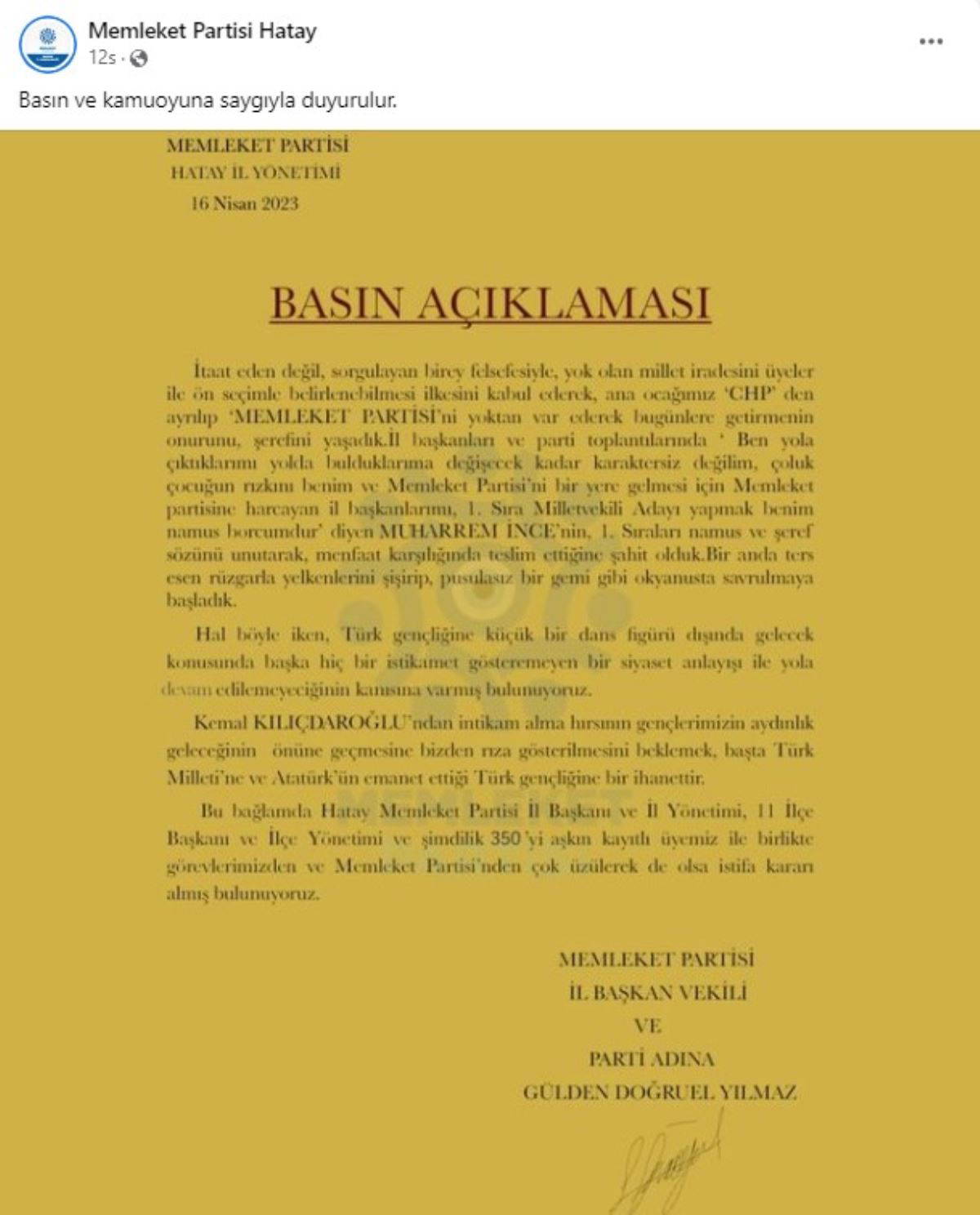 Bu bağlamda Hatay Memleket Partisi İl Başkan ve il Yönetimi, 11 ilçe Başkanı ve İlçe Yönetimi ve şimdilik 350’yi aşkın kayıtlı üyemiz ile birlikte görevlerimizden ve Memleket Partisi’nden çok üzülerek de olsa istifa kararı almış bulunuyoruz.”