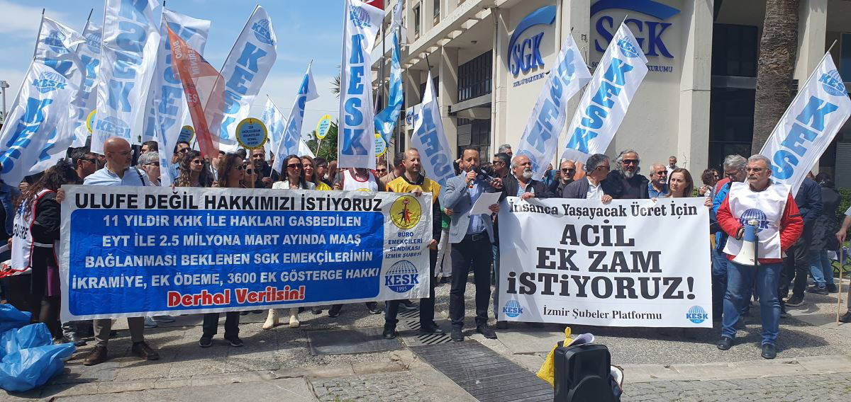 AKP iktidarına “İnsanca bir yaşam istiyoruz”, “Sermayeye değil, emekçiye bütçe”, “AKP’den hesabı emekçiler soracak” sloganları ile seslenen İzmir’deki kamu emekçileri, taleplerini açtıkları “Acil ek zam istiyoruz” pankartıyla duyurdu. Kamu emekçileri adına hazırlanan ortak açıklamayı okuyan KESK İzmir Şubeler Platformu Dönem Sözcüsü Veysel Beyazadam, artan hayat pahalılığı karşısında maaşların eridiğine dikkat çekerek, “Fakirin, fukaranın ekmeği olan kuru soğanın fiyatı bile bir yılda beş kattan fazla arttı. Mahsuni Şerif’in dediği gibi “Yiğit kuru soğana muhtaç” hale getirildi. Daha ötesi var mı? Bu hayat pahalılığında borçla harçla ayın sonunu getiremiyoruz. Hepimize dayatılan bu yoksulluk tablosu 21 yıldır ülkeyi yönetenlerin eseridir. Torba yasalara koydukları yarım yamalak düzenlemeleri müjde olarak yutturmaya çalıştılar. Şimdi de alanlara çıkıp bir muhalefet partisi gibi seçim vaatlerini sıralıyorlar."