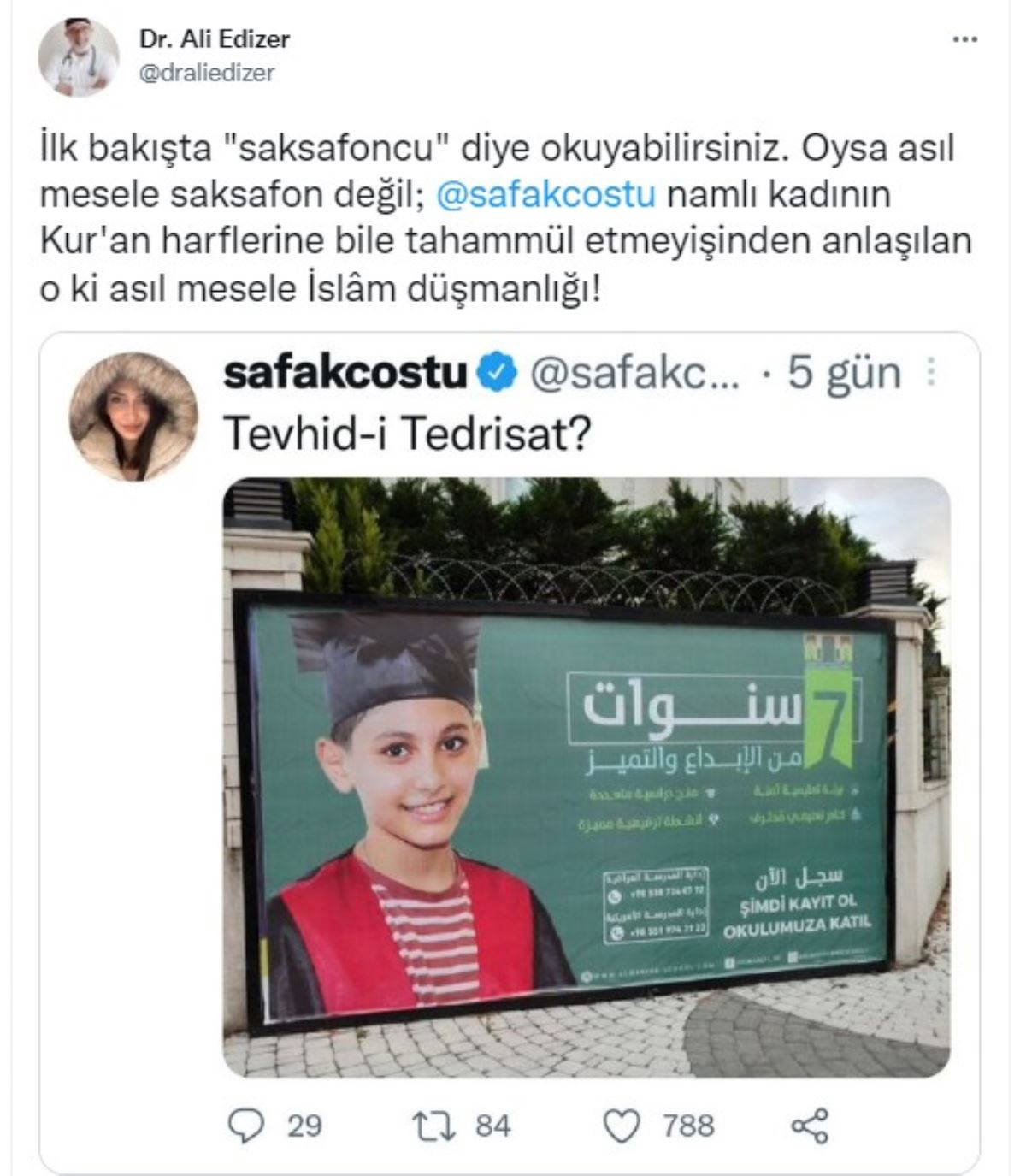 Edizer, paylaşımında "İlk bakışta 'saksafoncu' diye okuyabilirsiniz. Oysa asıl mesele saksafon değil; @safakcostu namlı kadının Kur'an harflerine bile tahammül etmeyişinden anlaşılan o ki asıl mesele İslâm düşmanlığı!" ifadelerini kullandı.