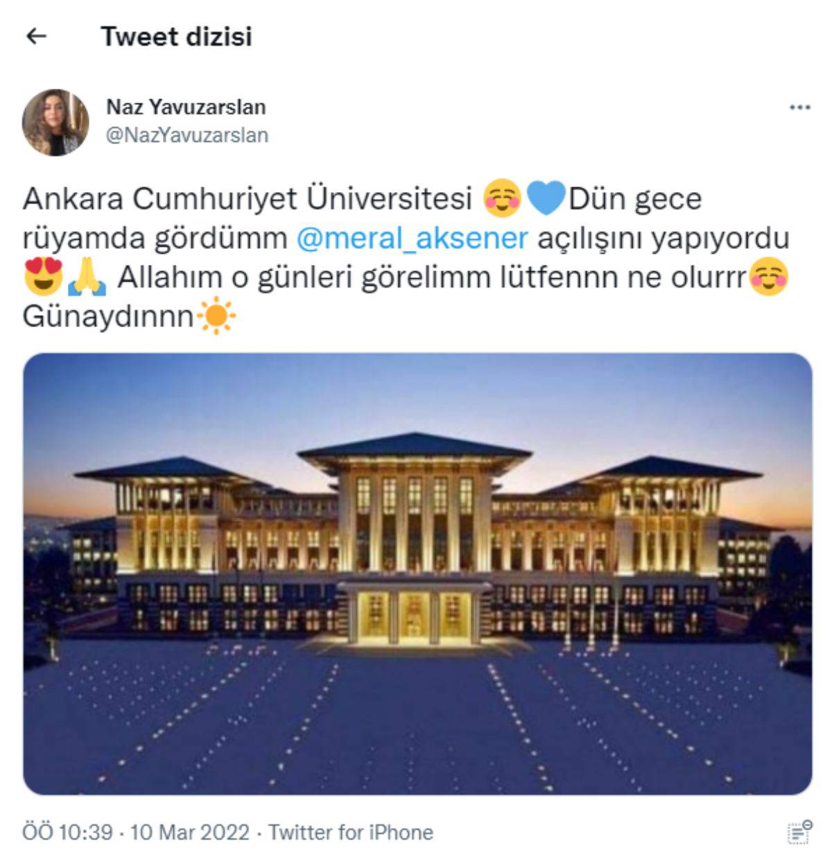 Naz Yavuzaslan isimli bir sosyal medya kullanıcısı "Dün gece rüyamda gördüm" diyerek Saray'ın fotoğrafını paylaştı ve Saray'ın Ankara Cumhuriyet Üniversitesi olduğunu ve açılışını da Meral Akşener'in yaptığını yazdı.