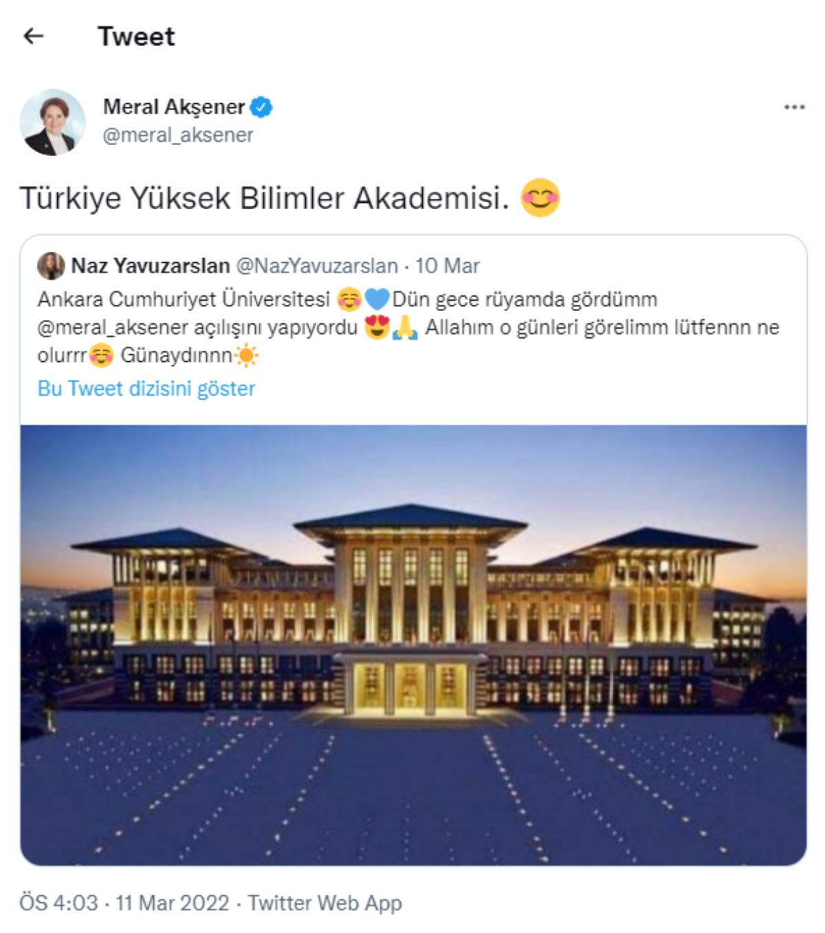 İYİ Parti Genel Başkanı Meral Akşener, söz konusu tweeti alıntılayarak, Saray ile ilgili planını açıkladı. Akşener, paylaşımında Saray'ın kendi iktidarları döneminde "Türkiye Yüksek Bilimler Akademisi" olacağını ifade etti.