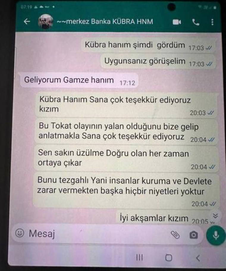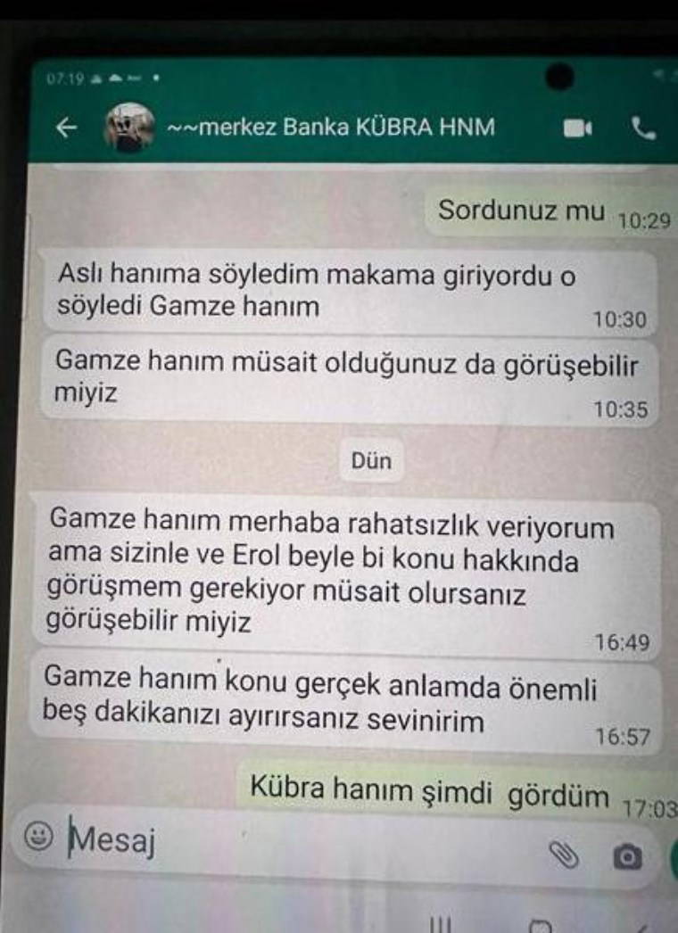 Güya ben Kübra hanımı tokatlamışım. Güya ben bir kadın çalışanı tokatlamışım diyerek bankada dedikodu çıkarılacak ve haber yapılacakmış. WhatsApp mesajlarında da Kübra adlı çalışanın adını kullanarak bizlere iftira atılacağı, başkanın da bizler üzerinden yıpratılarak itibarının yerlere serileceği amaçlanmıştı. Akşam da kendisine teşekkür mesajı gönderdik. Yaptığı tam anlamıyla iyi bir insanlık örneğiydi. Mesajlarda görebilirsiniz. Tarih 5 ve 6 Ocak. Kübra kızımız, sağ olsun Gaye Hanımla görüşmek için de bayağı çabalamış. Mesajlarda da belirtildiği gibi atılan iftiraya alet olmak istemiyor Kübra kızımız. Diyor ki “Ben kim olursa olsun iftiradan, kul hakkından korkarım. İnanıyorum ki er ya da geç, her şey ortaya çıkacak."