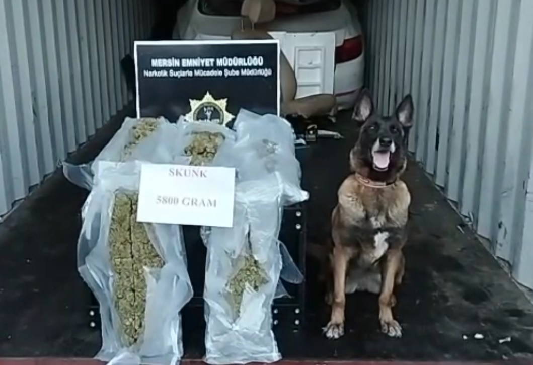 Yasal yükü oto yedek parçası olan konteynerde, narkotik köpeği ile yapılan aramada; valizler içine gizlenen, 5 paket halinde vakumlu poşetler içinde ve piyasa değeri 750 bin TL olan 5 kilo 800 gram skunk ele geçirildi.