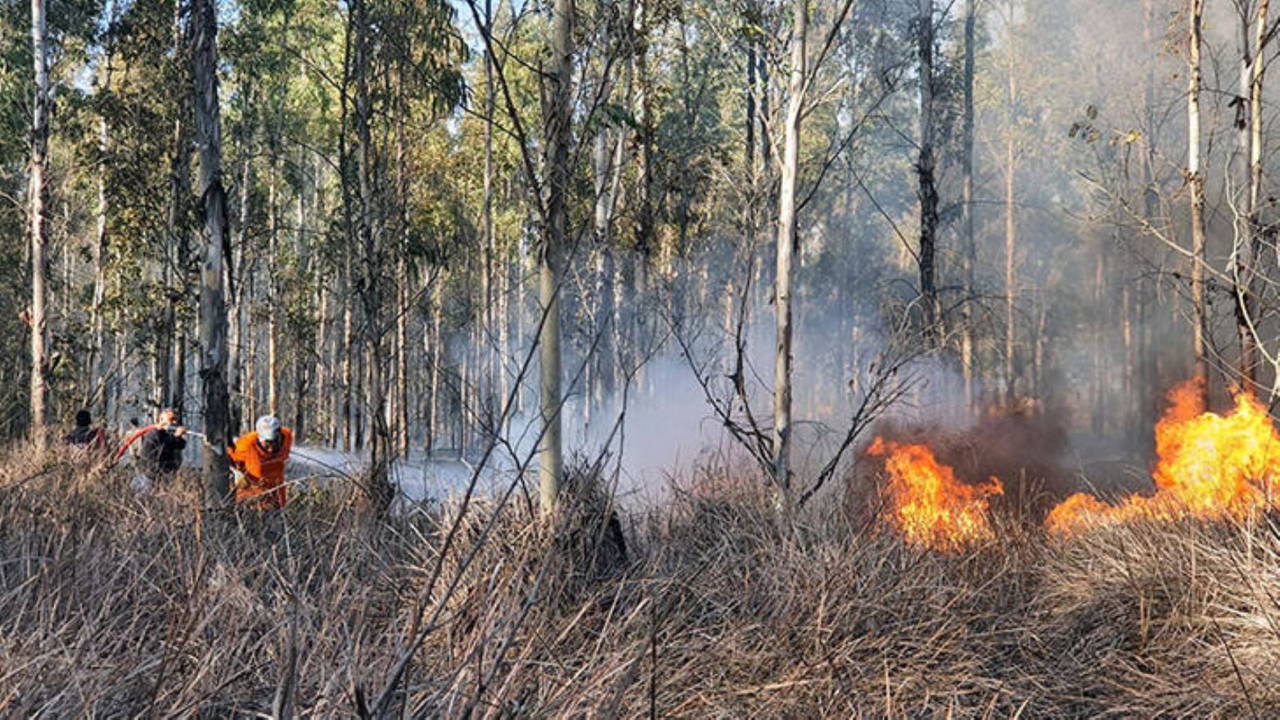 Okaliptusların bulunduğu orman alanında, rüzgârın etkisiyle büyüyen yangının söndürülmesi için müdahalenin sürdüğü aktarıldı.