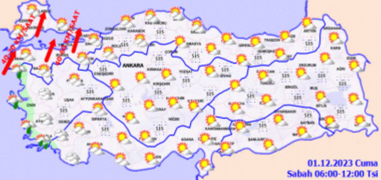 Meteoroloji Genel Müdürlüğü (MGM) tarafından yapılan son değerlendirmelere göre yurdun kuzey, iç ve batı kesimlerinin parçalı yer yer çok bulutlu, akşam saatlerine kadar Kıyı Ege'nin aralıklı sağanak yağışlı, diğer yerlerin az bulutlu ve açık geçeceği tahmin ediliyor. Sabah ve gece saatlerinde iç ve doğu kesimlerde yer yer pus ve sis bekleniyor.