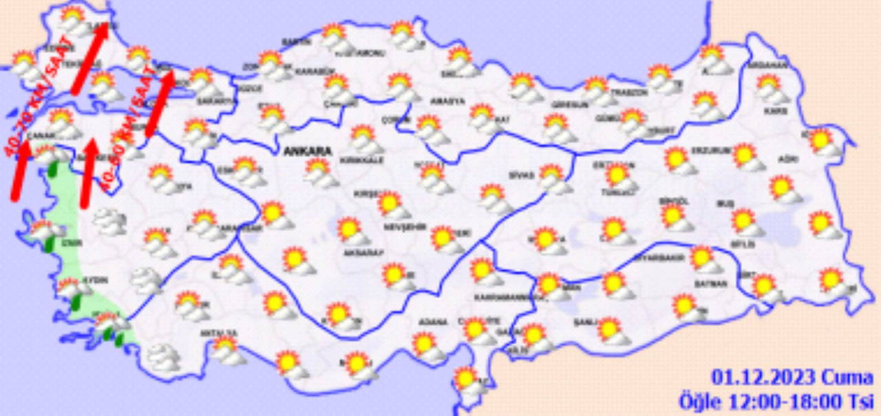 Rüzgârın; Marmara ve Kuzey Ege kıyılarında güneyli yönlerden kuvvetli, zaman zaman kısa süreli fırtına şeklinde (40-70 km/saat) esmesi beklendiğinden yaşanabilecek olumsuzluklara karşı dikkatli ve tedbirli olunması gerekmektedir.