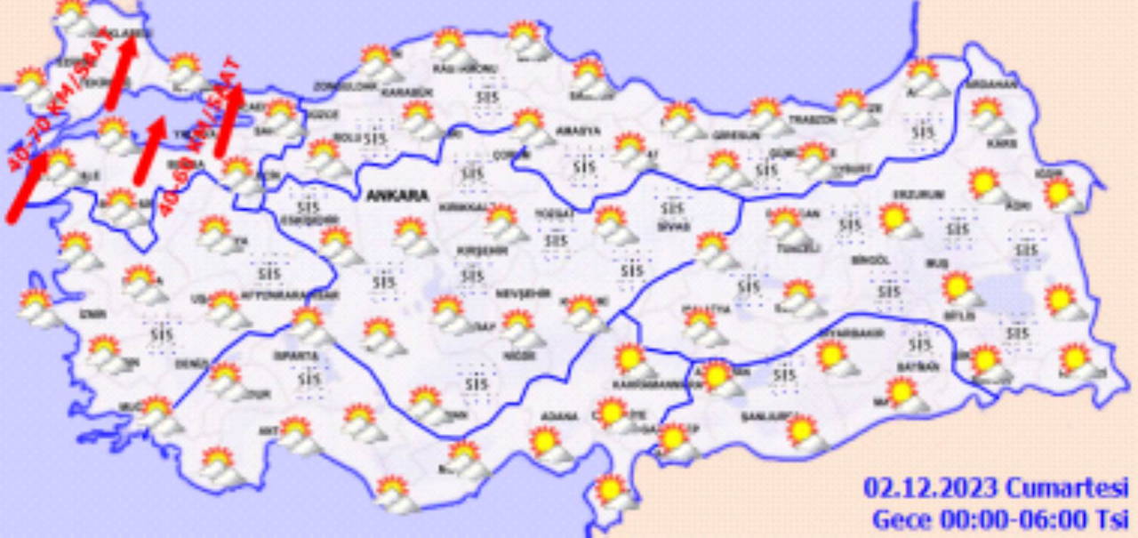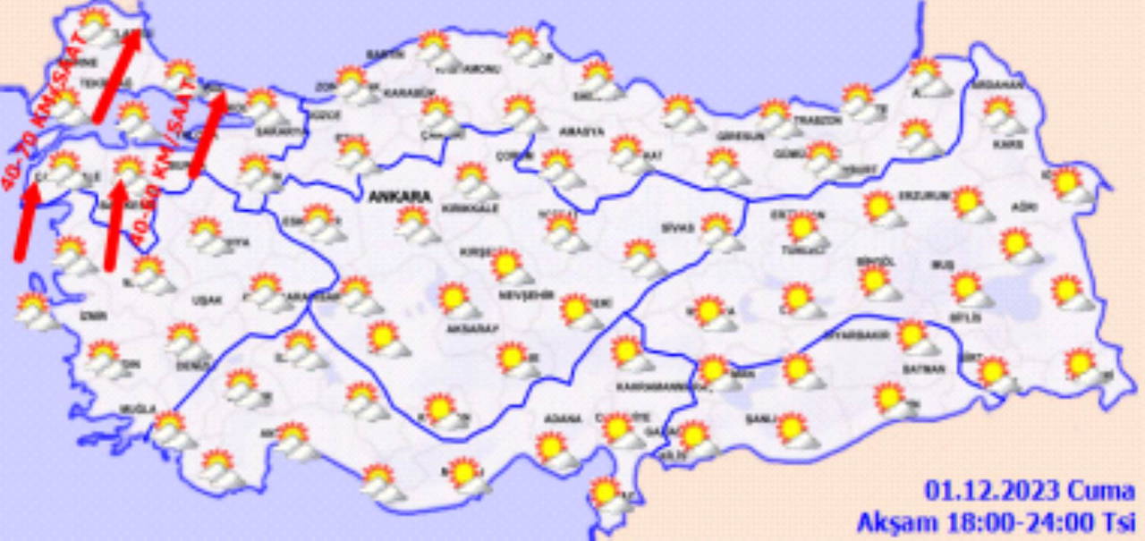 Rüzgarın güneyli yönlerden hafif ara sıra orta kuvvette, Marmara ve Kuzey Ege kıyılarında kuvvetli, zaman zaman kısa süreli fırtına şeklinde (40-70 km/saat) esmesi bekleniyor.