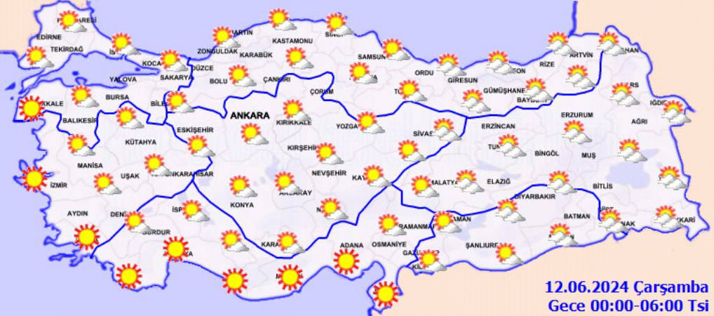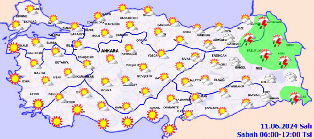 Meteoroloji Genel Müdürlüğü (MGM) tarafından yapılan son değerlendirmelere göre: Ülkemizin doğu kesimlerinin parçalı bulutlu, Doğu Anadolu’nun kuzeydoğusu ile Hakkari çevreleri, Van'ın doğu kesimleri ve Artvin’in iç kesimlerinin yerel olmak üzere sağanak ve gök gürültülü sağanak yağışlı, diğer yerlerin az bulutlu ve açık geçeceği tahmin ediliyor.