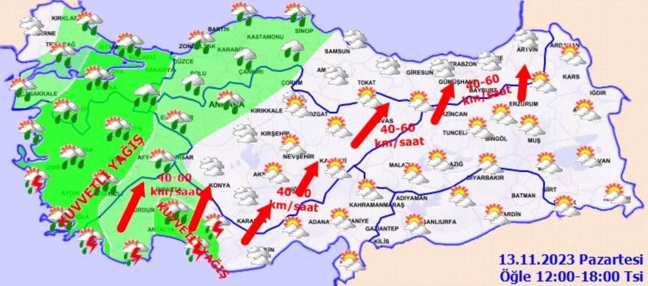 Rüzgarın, Marmara'nın kuzeyi ile Batı ve Orta Karadeniz kıyılarında kuzeyli, Batı Akdeniz'in iç kesimleri, İç Anadolu’nun güney ve doğusu, Doğu Karadeniz’in iç kesimleri ile Doğu Anadolu’nun kuzeyinde güneyli yönlerden kuvvetli olarak (40-60 km/saat) esmesi beklendiğinden meydana gelebilecek olumsuzluklara karşı dikkatli ve tedbirli olunmalı.