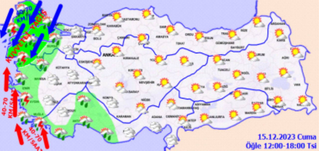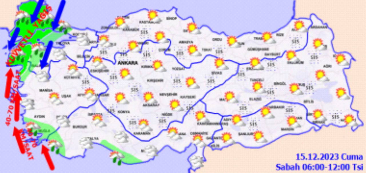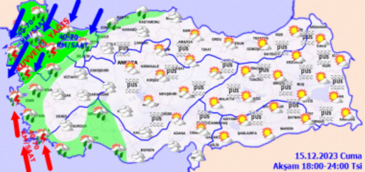Parçalı ve çok bulutlu, Kıyı Ege ve Manisa çevrelerinin yağmur ve sağanak yer yer gök gürültülü sağanak yağışlı geçeceği tahmin ediliyor. Yağışların Kuzey Ege kıyılarında yer yer kuvvetli olması bekleniyor. Rüzgarın Kıyı Ege'de güney yönlerden kuvvetli ve zaman zaman kısa süreli fırtına (40-70 km/saat) olarak esmesi bekleniyor. Sabah ve gece saatlerinde iç kesimlerinde yer yer pus ve sis görüleceği tahmin ediliyor.