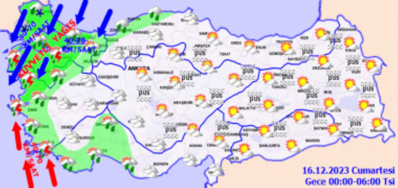 Yağışların, genellikle yağmur ve sağanak, yer yer gök gürültülü sağanak, gece saatlerinden sonra Edirne ve Kırklareli çevrelerinde karla karışık yağmur ve kar şeklinde olması bekleniyor. Yağışların, Marmara'nın batısı, İstanbul, Bursa, Yalova ve Kocaeli çevreleri ile Kuzey Ege kıyılarında yer yer kuvvetli olacağı tahmin ediliyor. Sabah ve gece saatlerinde Marmara'nın doğusu ile iç ve doğu kesimlerde yer yer pus ve sis bekleniyor.