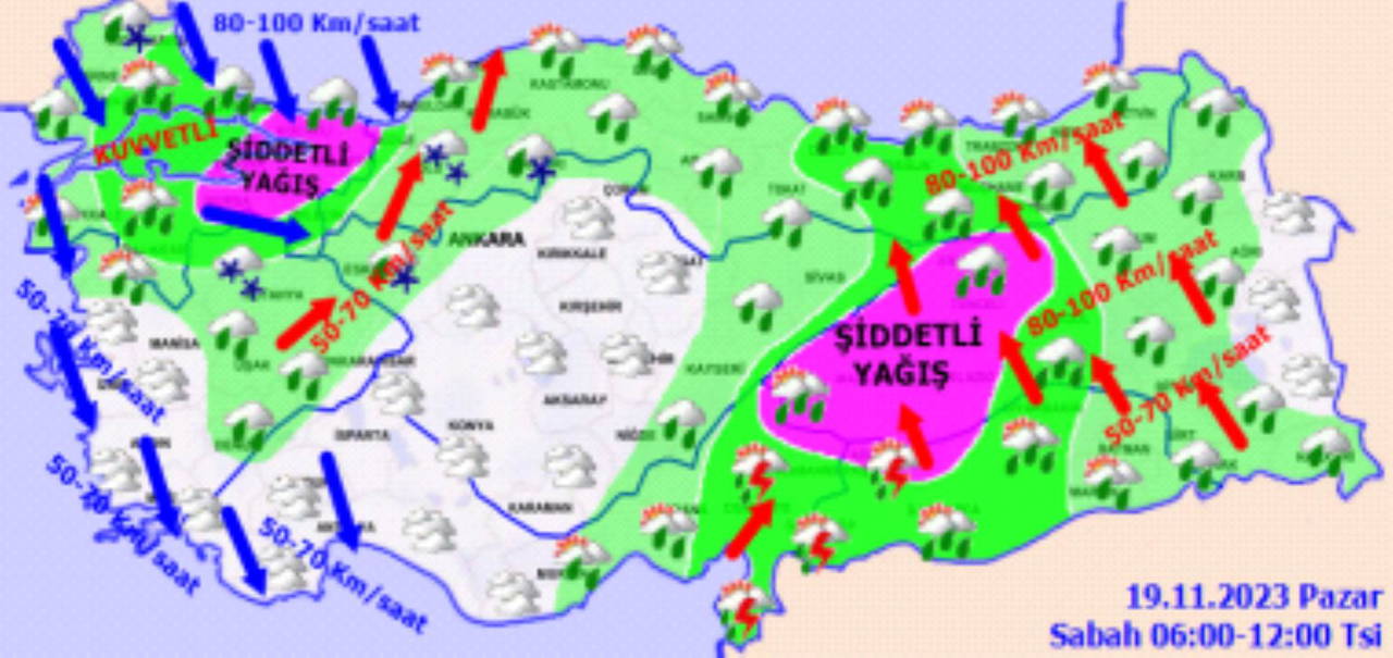 Rüzgârın, Marmara, Ege ve Batı Akdeniz’de kuzeyli yönlerden, Karadeniz, İç Anadolu, Doğu Akdeniz, Doğu ve Güneydoğu Anadolu’da güneyli yönlerden kuvvetli ve kısa süreli fırtına (50-80 km/saat), Marmara’nın kuzeyi ve Batı Karadeniz kıyılarında çok kuvvetli ve tam fırtına (80-110 km/saat) şeklinde eseceği tahmin edildiğinden yaşanabilecek çatı uçması, ağaç devrilmesi, ulaşımda aksamalar, soba ve baca gazı zehirlenmeleri gibi olumsuzluklara karşı dikkatli ve tedbirli olunması gerekmektedir.