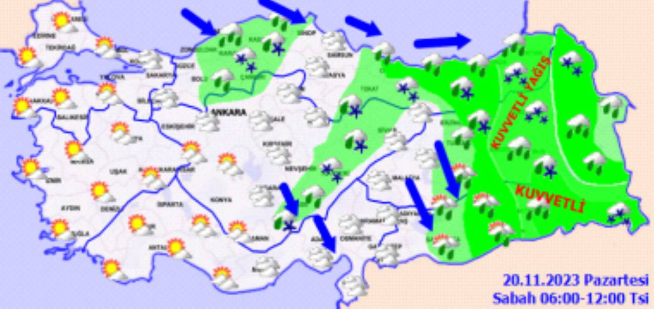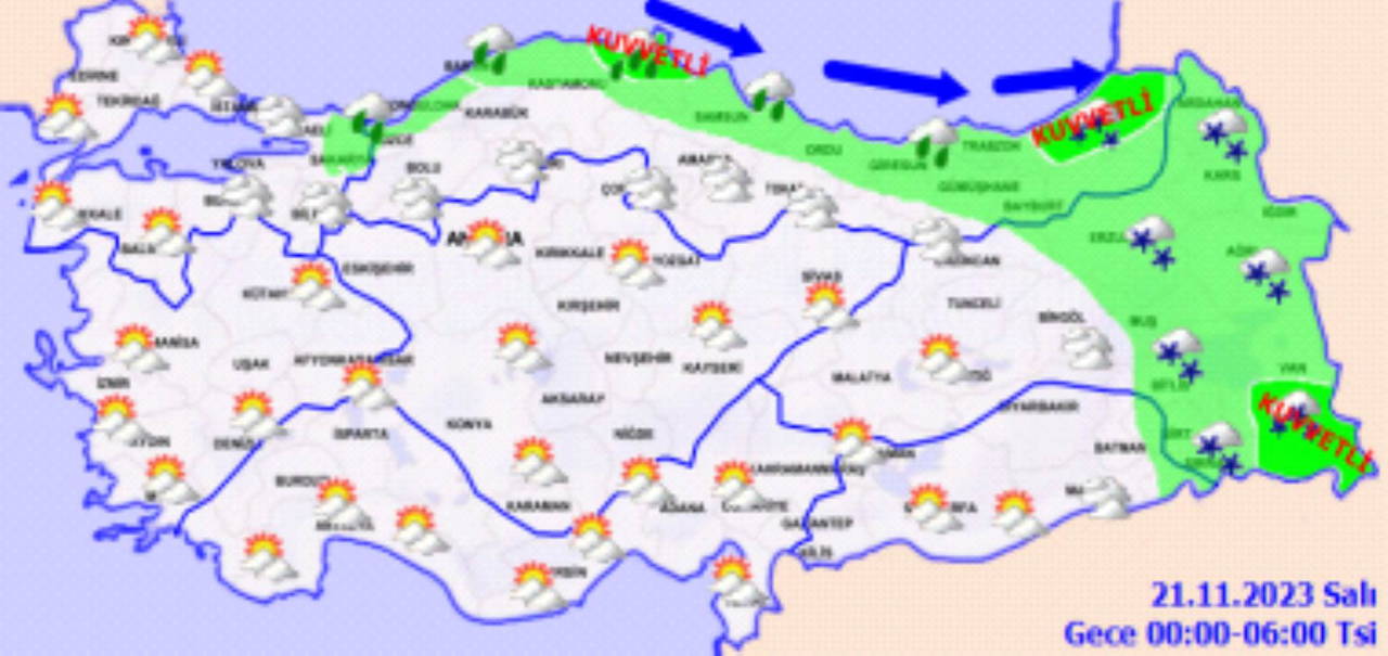 Genellikle yağmur ve sağanak, İç Anadolu'nun yüksekleri, Karadeniz’in iç kesimlerinin yüksekleri, Doğu Anadolu’nun kuzey ve doğusunun yüksek kesimlerinde karla karışık yağmur ve kar şeklinde görülecek olan yağışların; Batı Karadeniz kıyıları, Doğu Karadeniz, Doğu Anadolu’nun doğusu, Güneydoğu Anadolu'nun doğusu ile Ordu ve Düzce çevrelerinde kuvvetli, Doğu Karadeniz'in doğusu, Doğu Anadolu'nun güneydoğusu ile Batman ve Siirt çevrelerinde yer yer çok kuvvetli ve şiddetli olması bekleniyor.
