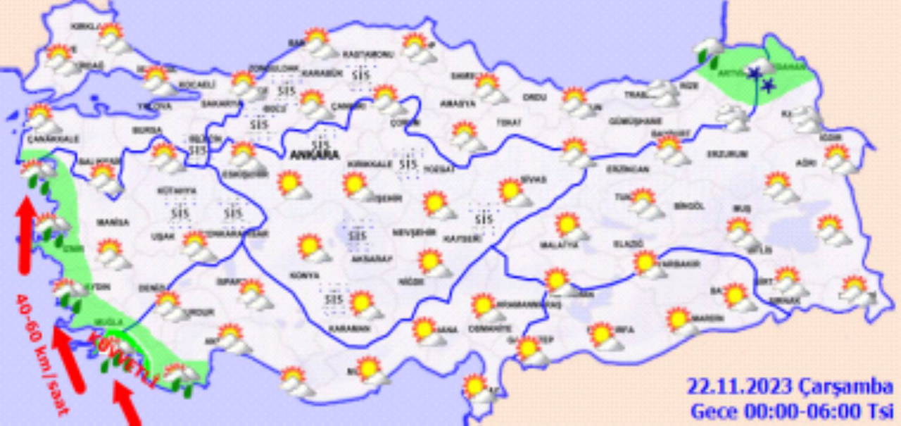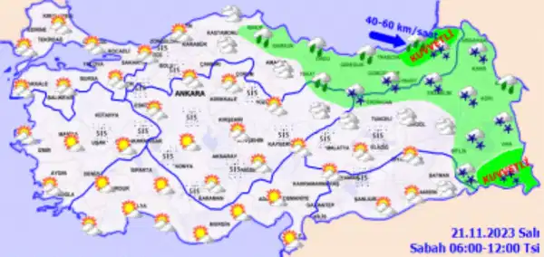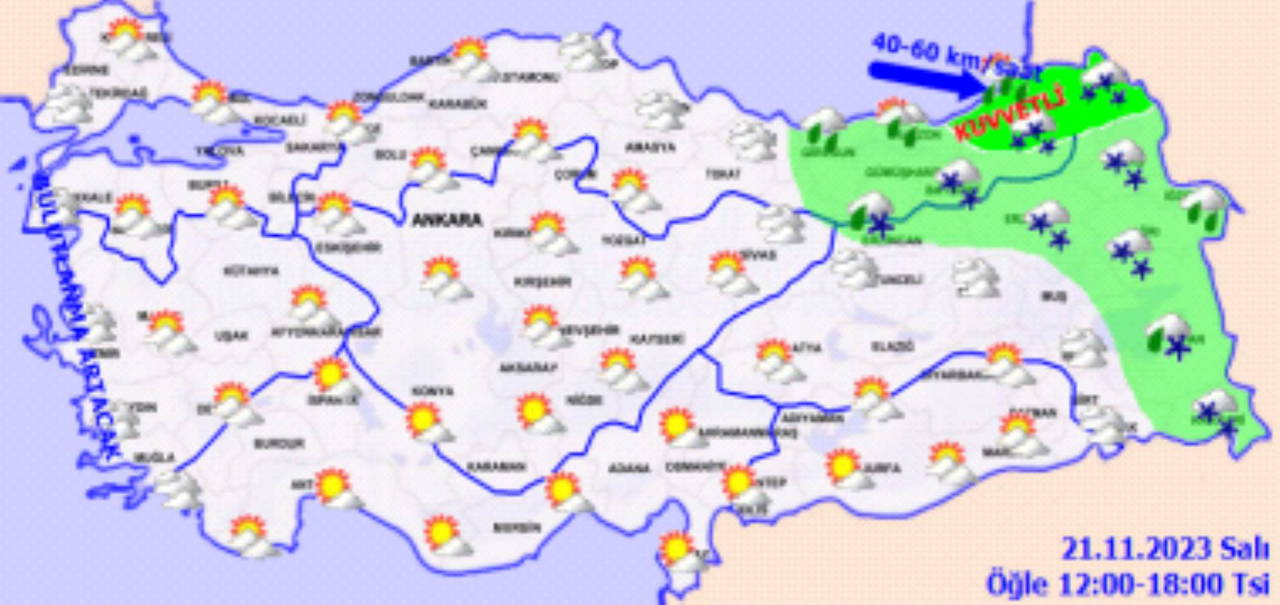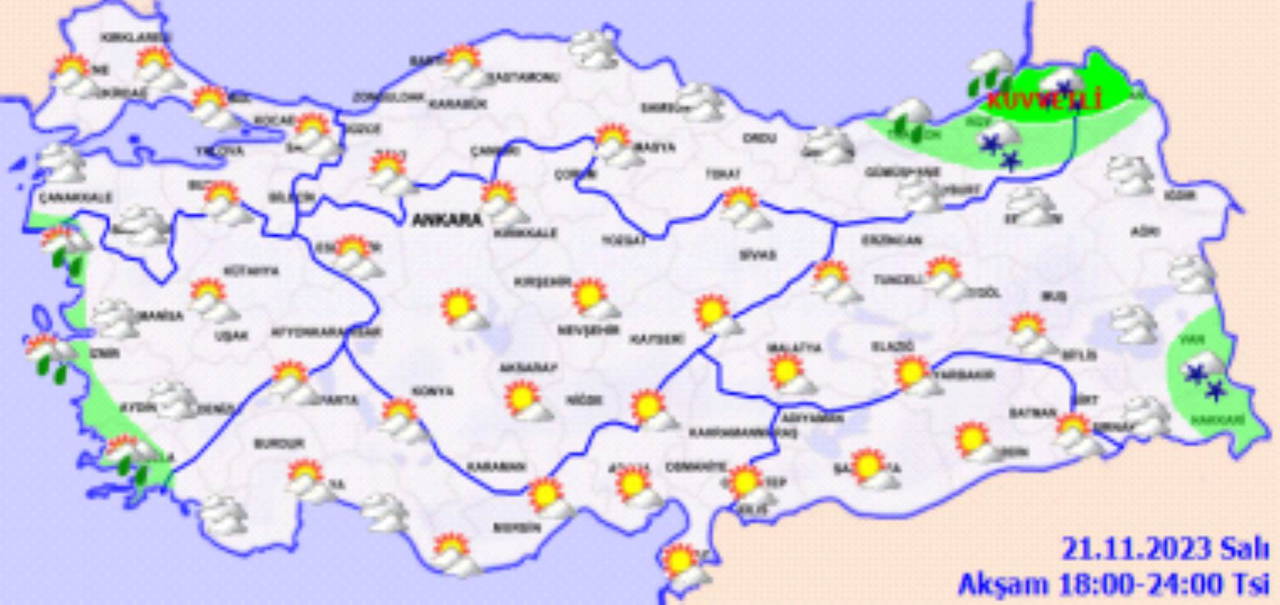 Kıyı kesimler ve Iğdır çevrelerinde yağmur ve sağanak, doğu kesimlerde karla karışık yağmur ve kar şeklinde görülecek olan yağışların; Rize, Artvin, Ardahan, Hakkâri ve Van'ın güneyinin yüksekleri ile gece saatlerinden itibaren Muğla'nın Marmaris ilçesinde yer yer kuvvetli olması bekleniyor. Rüzgârın Doğu Karadeniz'in doğusunda batı ve kuzeybatı, akşam saatlerinden sonra Ege kıyılarında güney ve güneydoğu yönlerden kuvvetli (40-60 km/saat) olarak