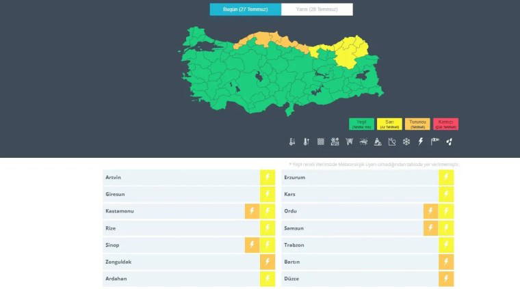 KUVVETLİ YAĞIŞ UYARISI: Yağışların, Karadeniz kıyıları, Artvin, Kars ve Ardahan çevreleri ile Erzurum'un kuzey kesimlerinde yer yer kuvvetli olması beklendiğinden yaşanabilecek olumsuzluklara karşı (sel, su baskını, yağış anında kuvvetli rüzgar, ulaşımda aksamalar, vb) dikkatli ve tedbirli olunmalı.
