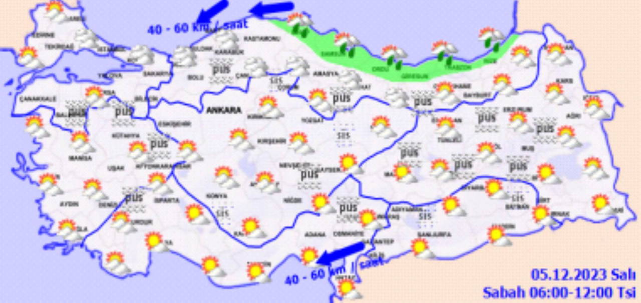 Rüzgarın genellikle güneyli yönlerden, zamanla Marmara, Batı Karadeniz ve Kuzey Ege'de kuzey, kuzeydoğu yönlerden hafif ara sıra orta kuvvette, Batı ve Orta Karadeniz kıyıları ile Doğu Akdeniz'in doğusunda kuvvetli (40-60 km/saat) olarak eseceği tahmin ediliyor.