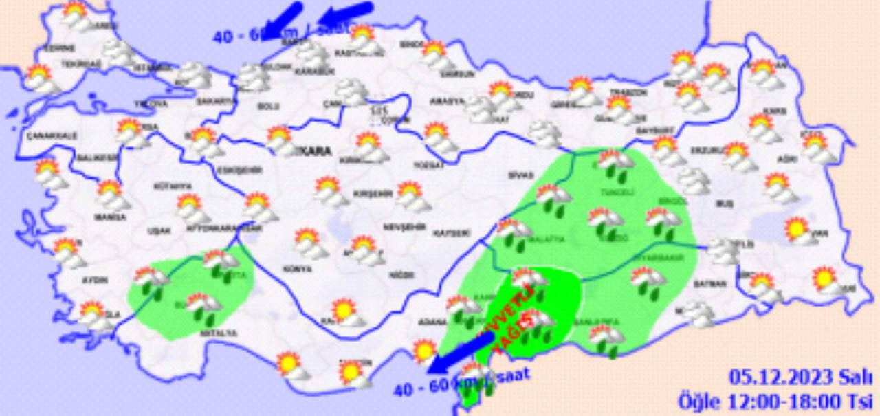 Meteoroloji Genel Müdürlüğü (MGM) tarafından yapılan son değerlendirmelere göre: Güney Ege kıyıları, Doğu Akdeniz'in doğusu, Orta ve Doğu Karadeniz'in kıyıları, Doğu Anadolu'nun kuzey ve batısı, Güneydoğu Anadolu ile Denizli, Burdur, Isparta, Mersin, Sinop, Bayburt, Artvin, Bitlis, Bingöl çevreleri ile Antalya'nın iç ve doğu kesimlerinin yağmur ve sağanak Güney Ege kıyıları ile Antalya çevrelerinin yer yer gök gürültülü sağanak yağışlı geçeceği tahmin ediliyor.
