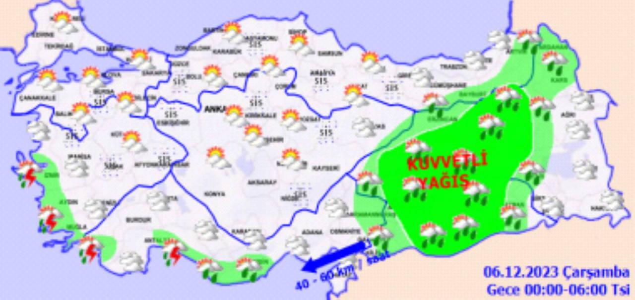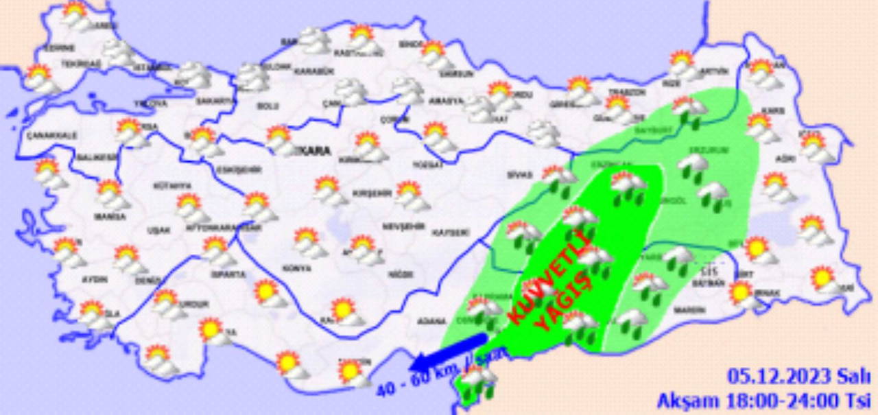Yağışların Hatay çevreleri, Doğu Anadolu'nun batısı, Güneydoğu Anadolu(Batman ve Siirt hariç) ile Erzurum ve Muş çevrelerinde yerel olmak üzere kuvvetli olması bekleniyor. Gece ve sabah saatlerinde iç ve doğu bölgelerde pus ve yer yer sis görüleceği tahmin ediliyor.