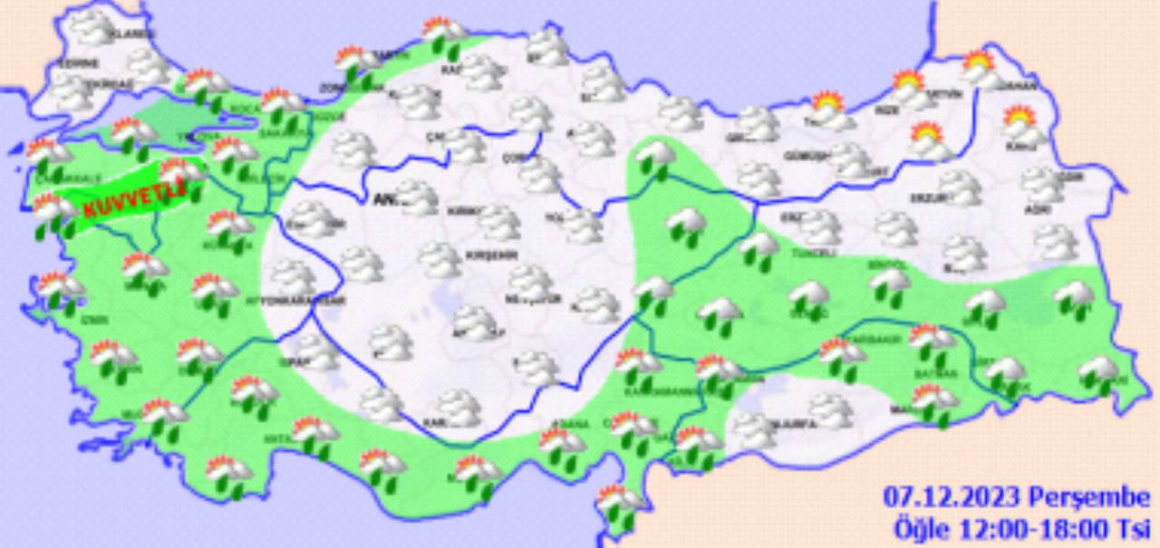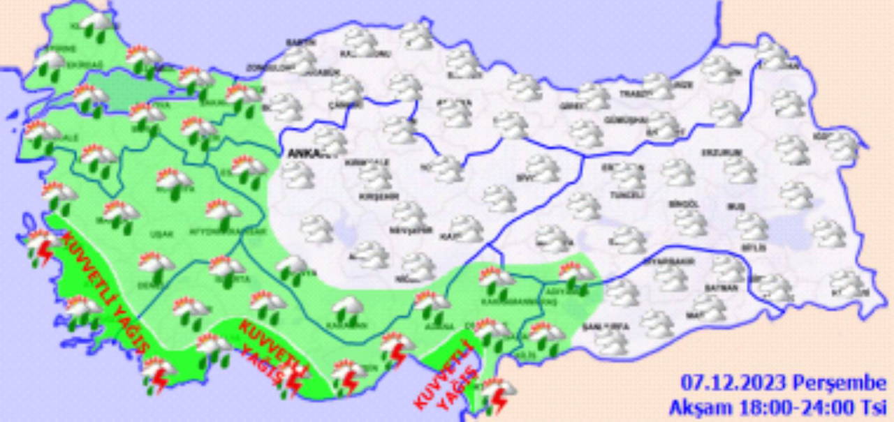 Yağışların; öğleden sonra Bursa ve Balıkesir çevreleri ile Çanakkale'nin doğu ilçelerinde, akşam ve gece saatlerinde Kıyı Ege ve Doğu Akdeniz ile İstanbul, Kocaeli, Yalova, Antalya, Gaziantep ve Kilis çevrelerinde yerel kuvvetli olması beklendiğinden dikkatli ve tedbirli olunması gerekmektedir.