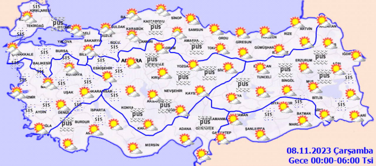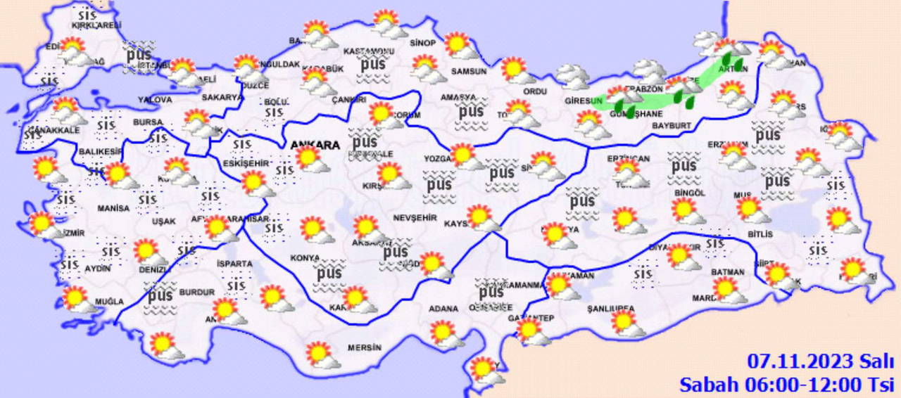 Meteoroloji Genel Müdürlüğü (MGM) tarafından yapılan son değerlendirmelere göre: Ülkemizin kuzeydoğusunun yer yer çok bulutlu, Doğu Karadeniz kıyı illerinin yüksek kesimlerinin sağanak yağışlı geçeceği tahmin ediliyor. Sabah ve gece saatlerinde batı, iç ve doğu kesimlerde pus ve yer yer sis bekleniyor.