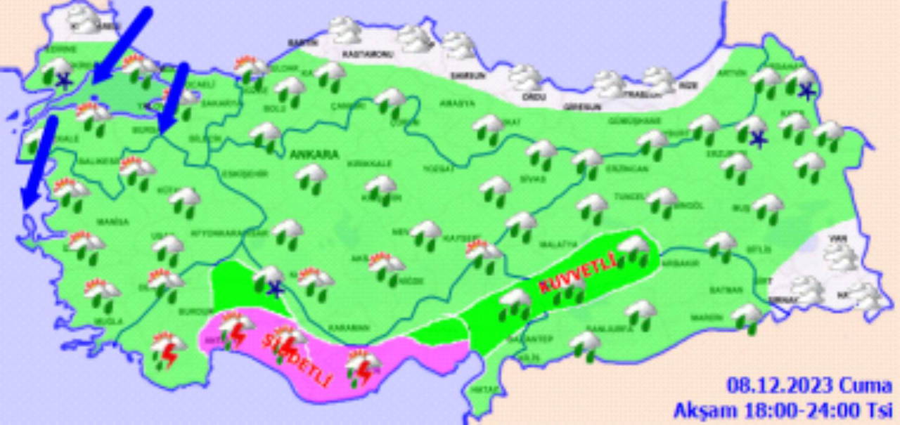 Yapılan son değerlendirmelere göre; Marmara'nın doğusu, Ege , Akdeniz, Doğu Anadolu'nun güneybatısı ile Çanakkale'nin doğusu, Diyarbakır ve Adıyaman çevrelerinde kuvvetli (21-50 kg/m2), Mersin ve Adana'nın güney kesimlerinde yer yer çok kuvvetli (21-75 kg/m2), Antalya’nın doğusunda çok kuvvetli ve yer yer şiddetli (51-100 kg/m2) sağanak ve gök gürültülü sağanak yağış bekleniyor. Yağışların Antalya’nın doğusunun 1500 m üzeri yüksek kesimlerinde (özellikle Antalya-Konya yolunun Alacabel mevkiinde) kuvvetli karla karışık yağmur ve kar şeklinde olması bekleniyor. Kuvvetli yağışlarla birlikte sel, su baskını, yıldırım, ulaşımda aksamalar, yağış anında kuvvetli rüzgar, yerel dolu yağışı gibi olumsuzluklara karşı dikkatli ve tedbirli olunmalıdır.