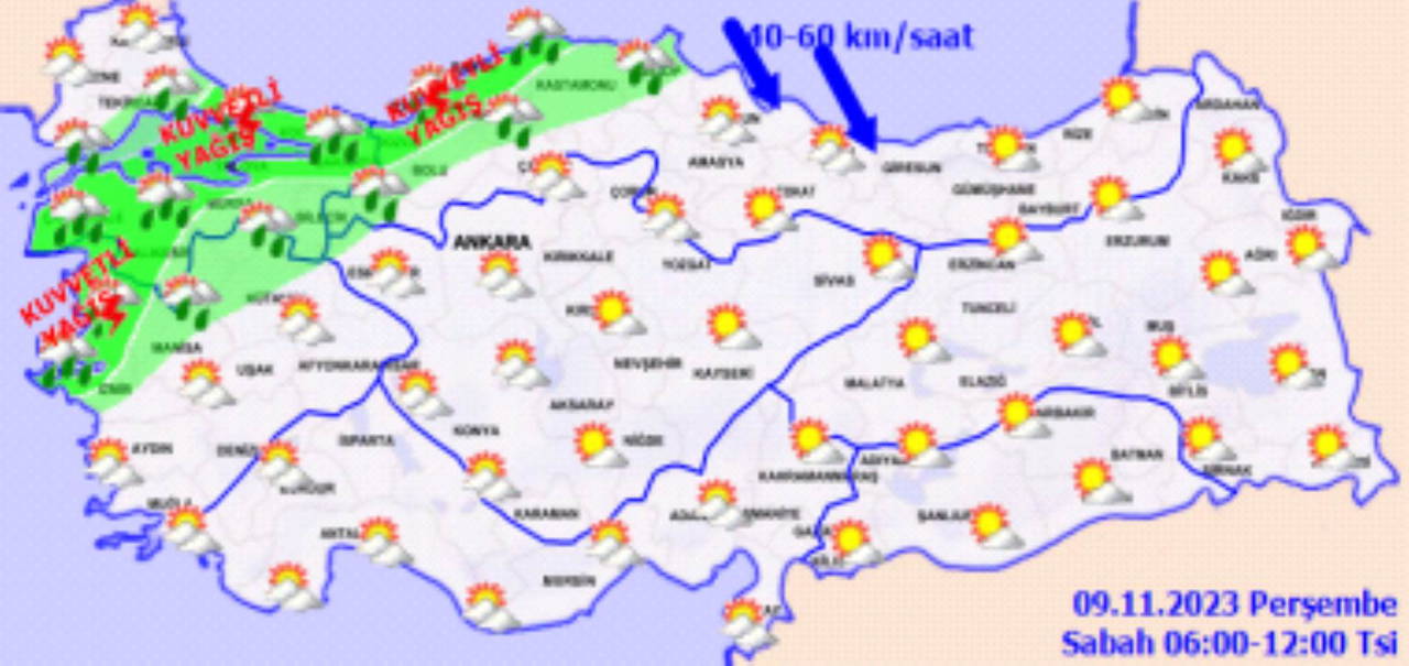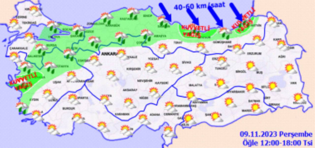 Yağışların, Kuzey Ege kıyıları, Karadeniz kıyıları (Sinop hariç) ile İstanbul, Kocaeli, Sakarya, Yalova, Balıkesir, Çanakkale ve Manisa çevrelerinde yer yer kuvvetli olması beklendiğinden yaşanabilecek olumsuzluklara karşı dikkatli ve tedbirli olunmalıdır.