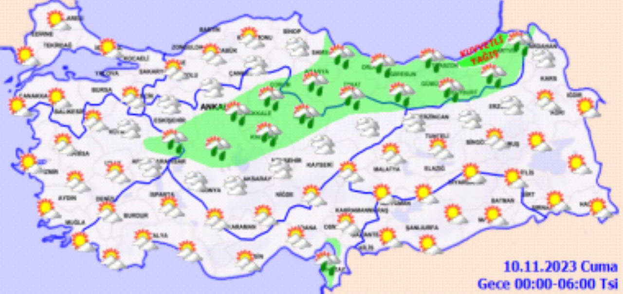Meteoroloji Genel Müdürlüğü tarafından yapılan son değerlendirmelere göre: Ülkemizin kuzey, iç ve batı kesimlerinin parçalı ve çok bulutlu, Marmara'nın güney ve doğusu, Kuzey ve Kıyı Ege, İç Anadolu'nun kuzeybatısı, Karadeniz, Tekirdağ, Kırşehir ve Yozgat çevreleri ile Hatay'ın kıyı kesimlerinin yerel olmak üzere sağanak ve yer yer gök gürültülü sağanak yağışlı, diğer yerlerin az bulutlu ve açık geçeceği tahmin ediliyor. Yağışların, Kuzey Ege kıyıları, Karadeniz kıyıları (Sinop hariç) ile İstanbul, Kocaeli, Sakarya, Yalova, Balıkesir, Çanakkale ve Manisa çevrelerinde yer yer kuvvetli olması bekleniyor.