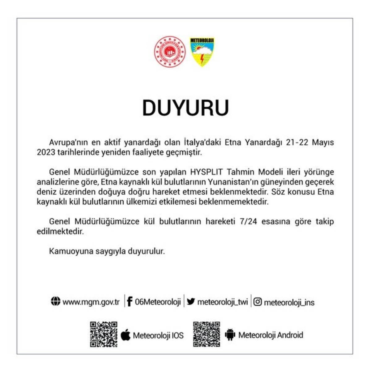 Yapılan açıklamada, "Avrupa'nın en aktif yanardağı olan İtalya'daki Etna Yanardağı 21-22 Mayıs 2023 tarihlerinde yeniden faaliyete geçmiştir. Genel Müdürlüğümüzce son yapılan HYSPLIT Tahmin Modeli ileri yörünge analizlerine göre, Etna kaynaklı kül bulutlarının Yunanistan'ın güneyinden geçerek deniz üzerinden doğuya doğru hareket etmesi beklenmektedir. Söz konusu Etna kaynaklı kül bulutlarının ülkemizi etkilemesi beklenmemektedir. Genel Müdürlüğümüzce kül bulutlarının hareketi 7/24 esasına göre takip edilmektedir" ifadelerine yer verildi.
