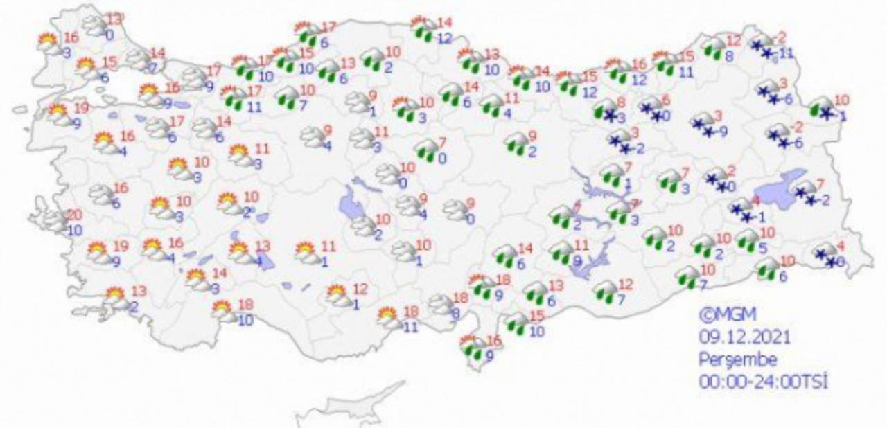 Yapılan son değerlendirmelere göre bugün; Marmara, Ege, Akdeniz (Kahramanmaraş dışında), İç Anadolu (Sivas dışında) ile Batı Karadeniz`in (Sinop dışında) yağmur ve sağanak, Marmara'nın batısı, Kıyı Ege ile Akdeniz kıyılarının yer yer gök gürültülü sağanak yağışlı geçeceği tahmin ediliyor.