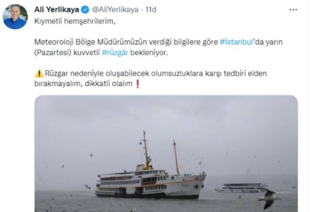 Vali Yerlikaya, Twitter hesabından yaptığı uyarıda, "Kıymetli hemşerilerim, Meteoroloji Bölge Müdürümüzün verdiği bilgilere göre İstanbul'da yarın kuvvetli rüzgâr bekleniyor. Rüzgar nedeniyle oluşabilecek olumsuzluklara karşı tedbiri elden bırakmayalım, dikkatli olalım" ifadelerini kullandı.