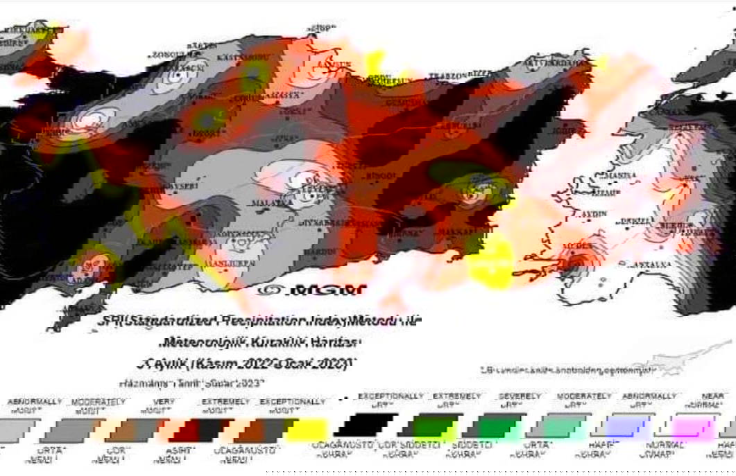 Meteoroloji Genel Müdürlüğü, 2023'ün ilk kuraklık haritasını paylaştı. Standart Yağış İndeksi (SPI) metoduna göre hazırlanan 3 aylık haritada birçok ilin 'olağanüstü kuraklık' yaşadığı belirlendi.