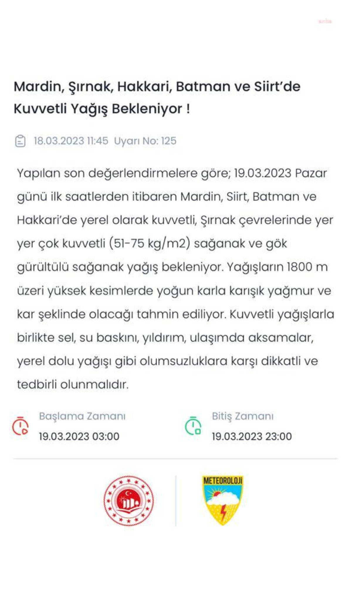 “Yapılan değerlendirmelere göre, 19.03.2023 Pazar günü ilk saatlerden itibaren Mardin, Siirt, Batman ve Hakkari’de yerel olarak kuvvetli, Şırnak çevrelerinde yer yer çok kuvvetli (51-75 kg/m2) sağanak ve gök gürültülü sağanak yağış bekleniyor. Yağışların 1800 m üzeri yüksek kesimlerde yoğun karla karışık yağmur ve kar şeklinde olacağı tahmin ediliyor. Kuvvetli yağışlarla birlikte sel, su baskını, yıldırım, ulaşımda aksamalar, yerel dolu yağışı gibi olumsuzluklara karşı dikkatli ve tedbirli olunmalıdır.”