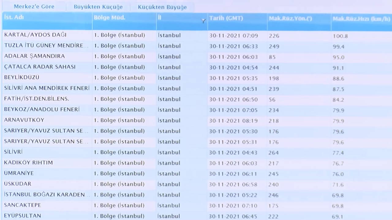 "Dün en yüksek rüzgar Beylikdüzü'nde saat 13.00 civarından 130 kilometre saat hızla oldu. Ardından Arnavutköy'de yine 13.00 civarında 124 kilometre hızla esen rüzgar oldu. Bir de Çatalca radar sahasında 15.00 gibi yine 120 kilometre hızla rüzgar oldu. Bugün itibaren 100 km saatte ulaşan rüzgarlar var. Kartal Aydos Dağı'nda 10.00 civarında 100 kilometre saat hızla rüzgar oldu. Yine Tuzla İTÜ yerleşkesi içinde için de 100 kilometreye ulaşan bir rüzgar oldu. Genel olarak 80 ile 90 kilometre arası bir rüzgar hızı var. Dün çok riskli olan Beylikdüzü'nde bugün 88 kilometre saate kadar ulaşan bir rüzgar var. Arnavutköy ise dün 125 kilometreye yakın rüzgar hızı vardı ancak şu an 80 kilometre civarında."